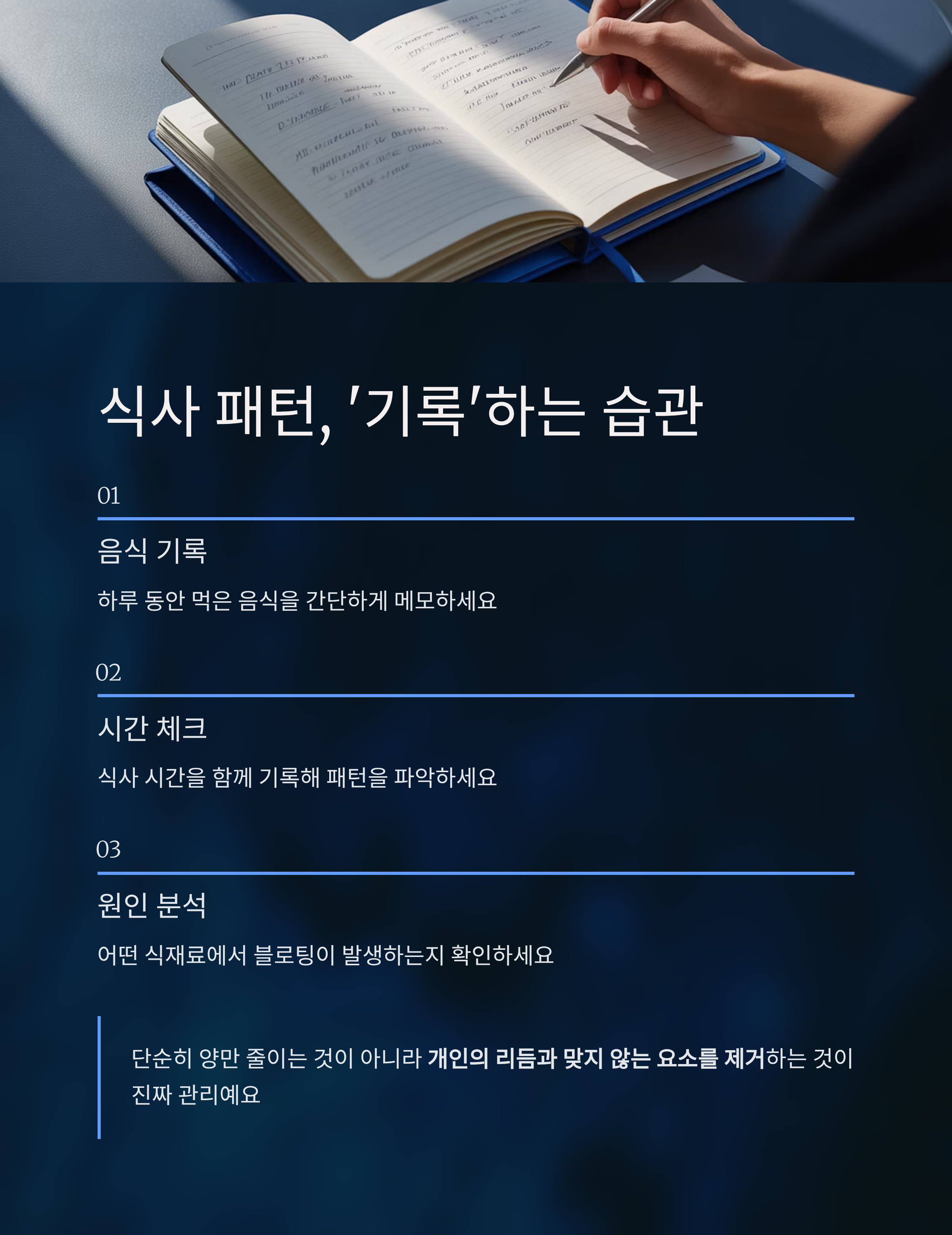 하루 동안 먹은 음식과 시간을 간단하게 메모하는 것만으로도, 어떤 식재료나 패턴에서 블로팅이 발생하는지 파악할 수 있습니다. 단순히 양만 줄이는 것이 아니라 개인의 리듬과 맞지 않는 요소를 제거하는 것이 진짜 관리예요.