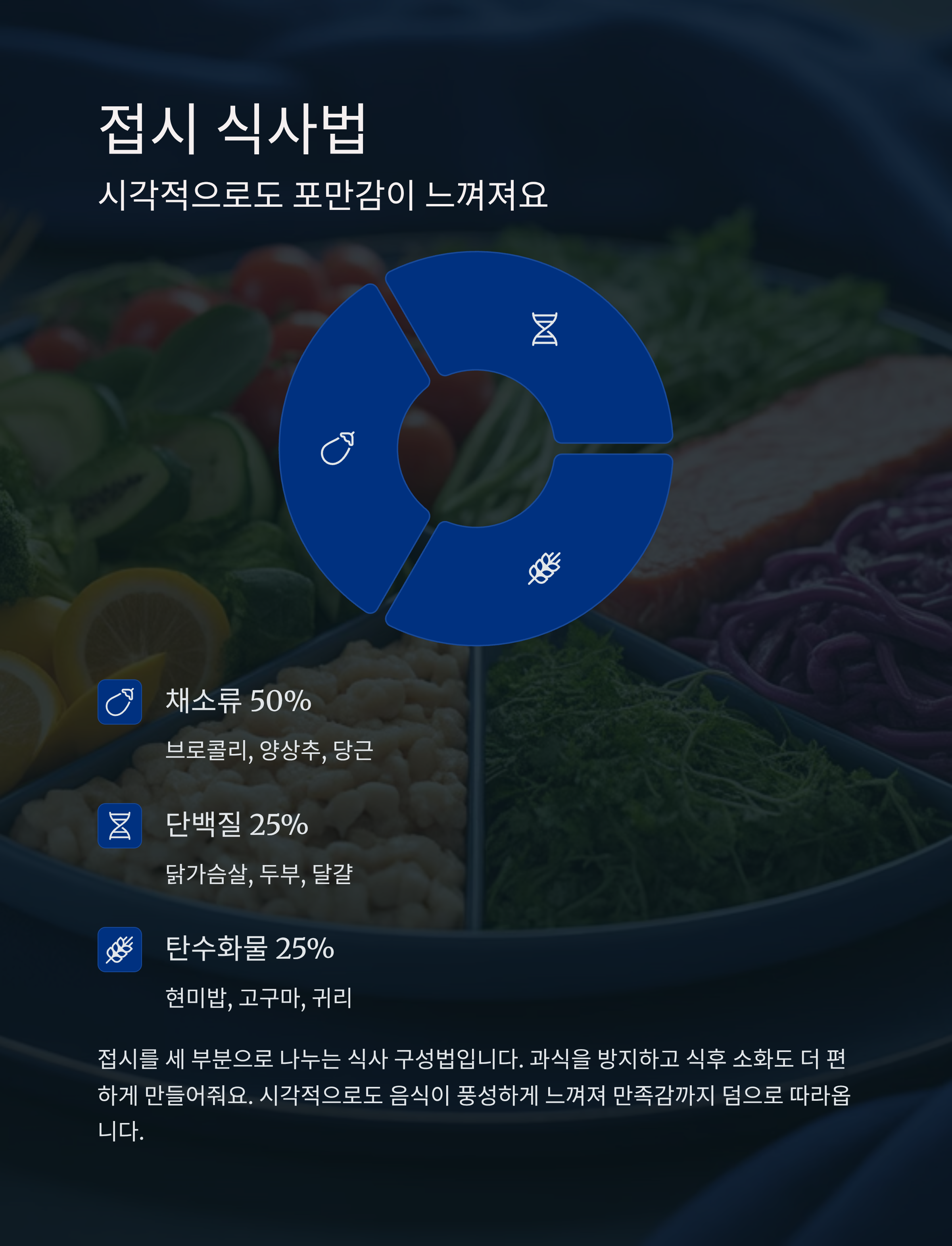접시 식사법이란 접시를 세 부분으로 나누는 식사 구성법입니다.
