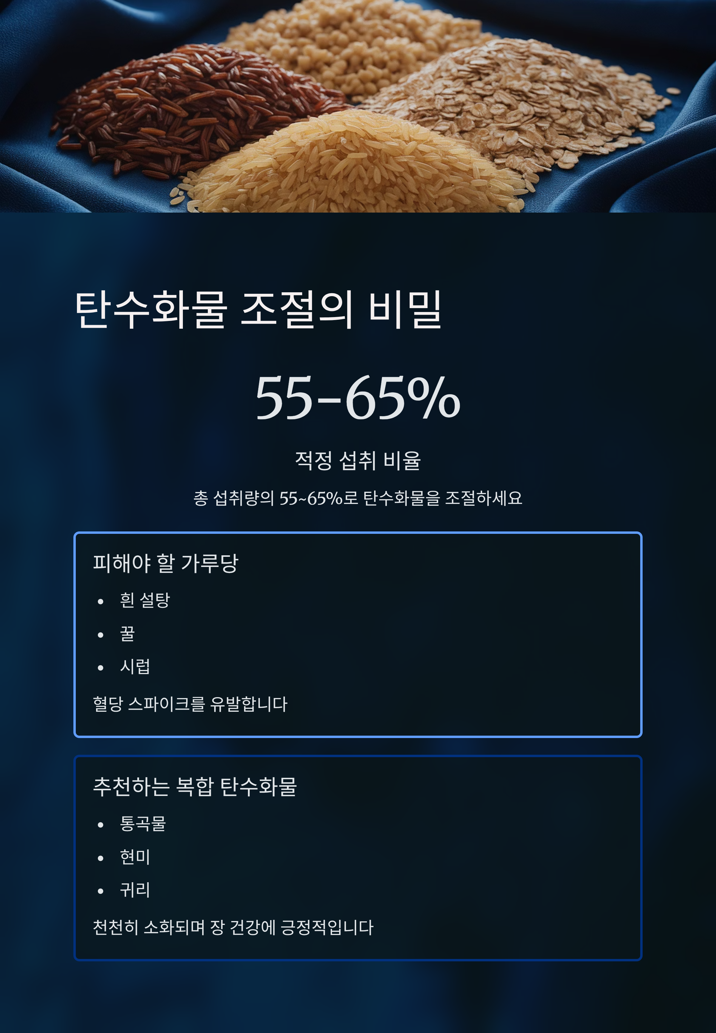 2. 탄수화물은 총 섭취량의 55~65%로 조절하되, ‘가루당’은 피하기