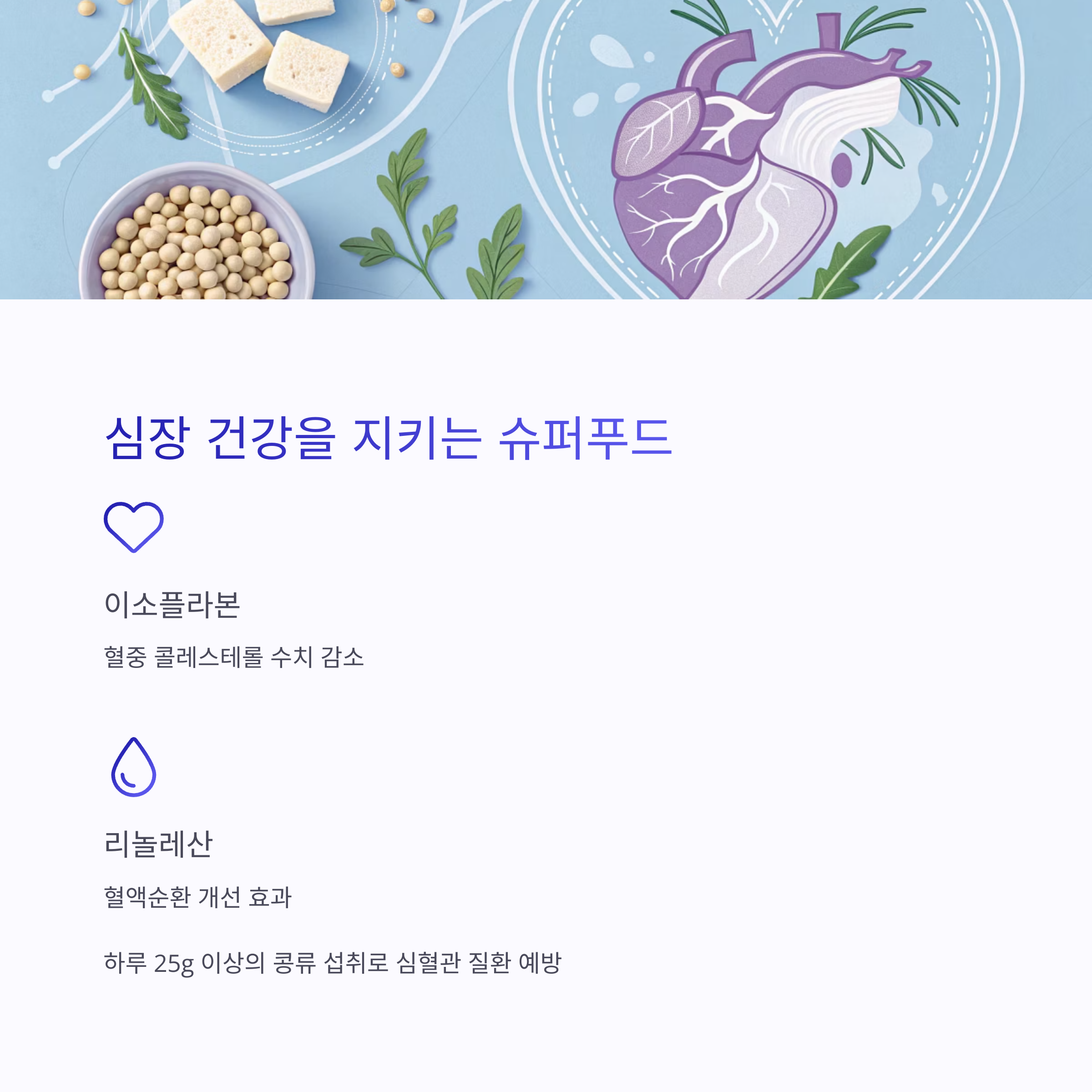 | 권장 콩 섭취량 | 일 25g 이상 (심혈관 예방) |