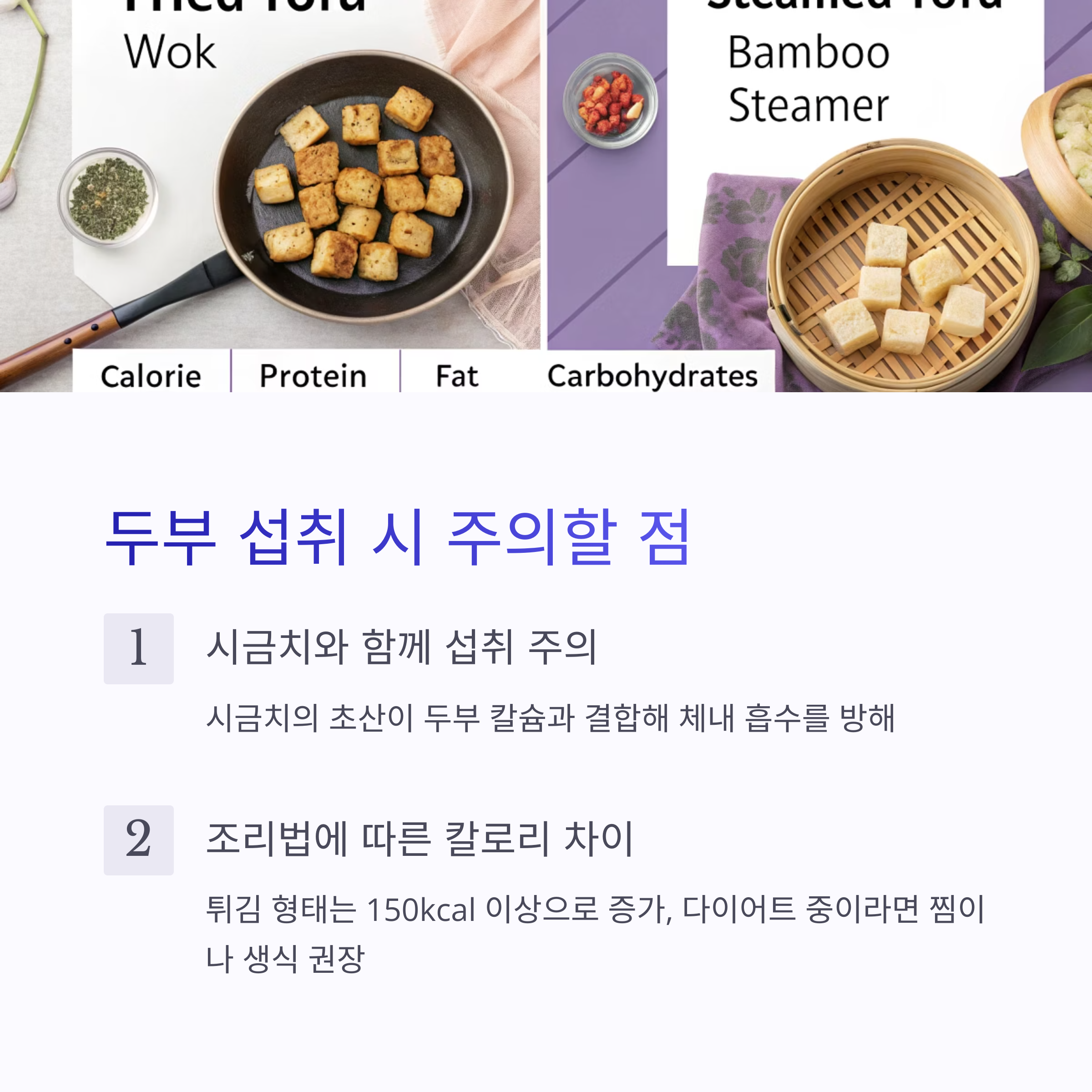 | 두부 100g 칼로리 | 70kcal에서 90kcal (부침 시 150kcal 이상) |