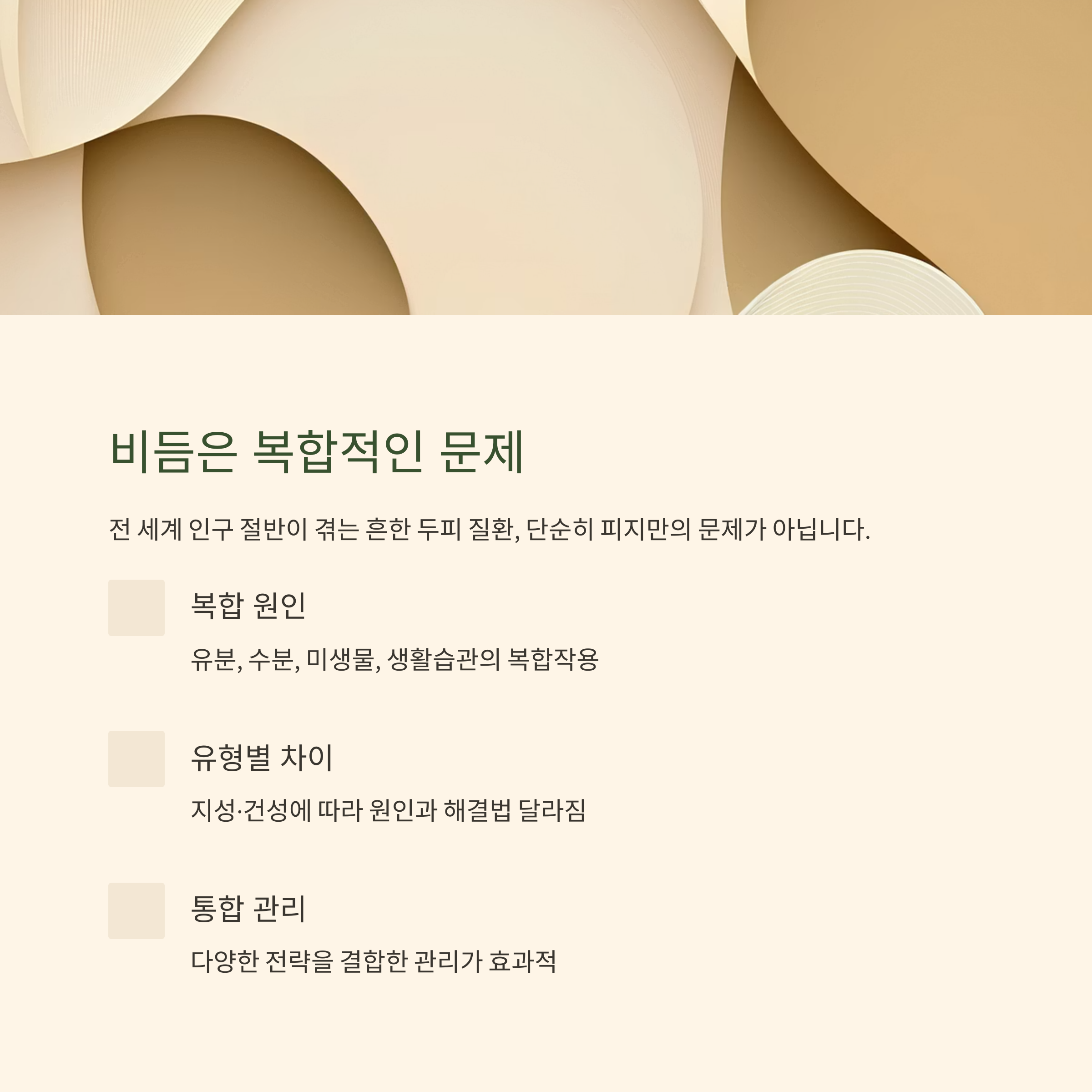 비듬은 유분, 수분, 미생물, 습관의 복합작용으로 발생하며 관리 또한 다차원적으로 접근해야 합니다.