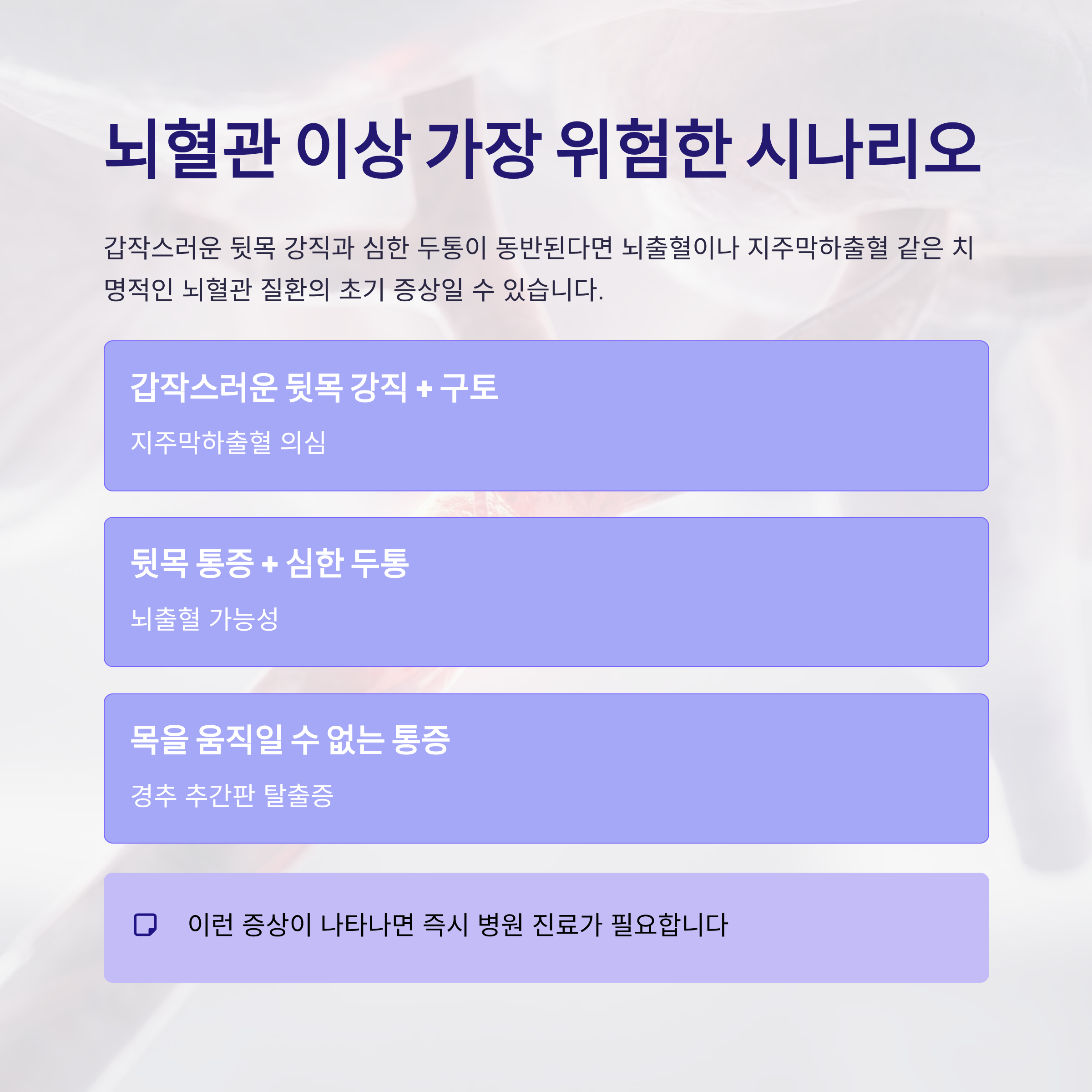 | 뒷목 통증 + 심한 두통 | 뇌출혈 가능성 |