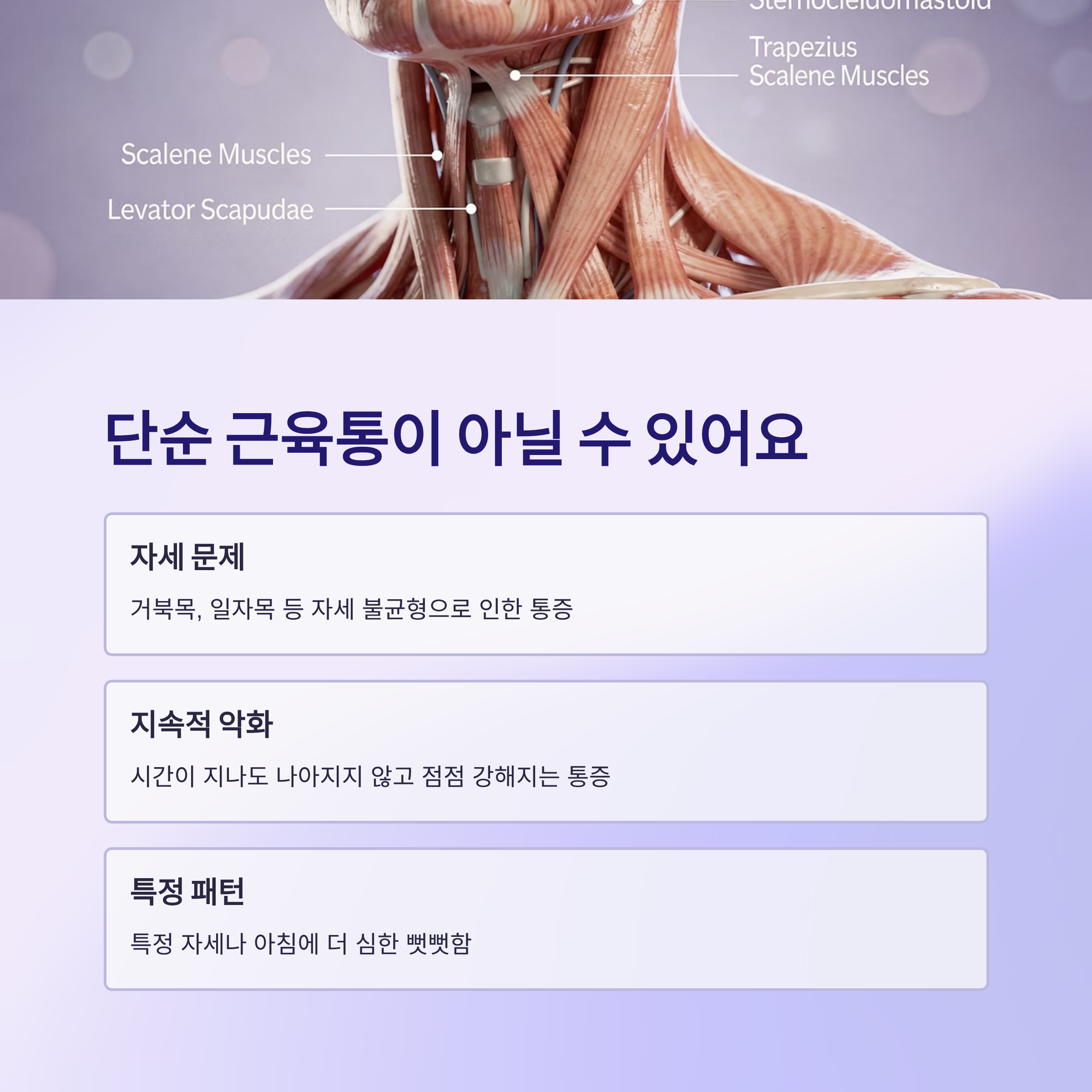 특히 특정 자세에서만 아프거나, 자고 일어났을 때 뻣뻣함이 더 심하다면 단순한 근육통 이상의 신호일 수도 있답니다.