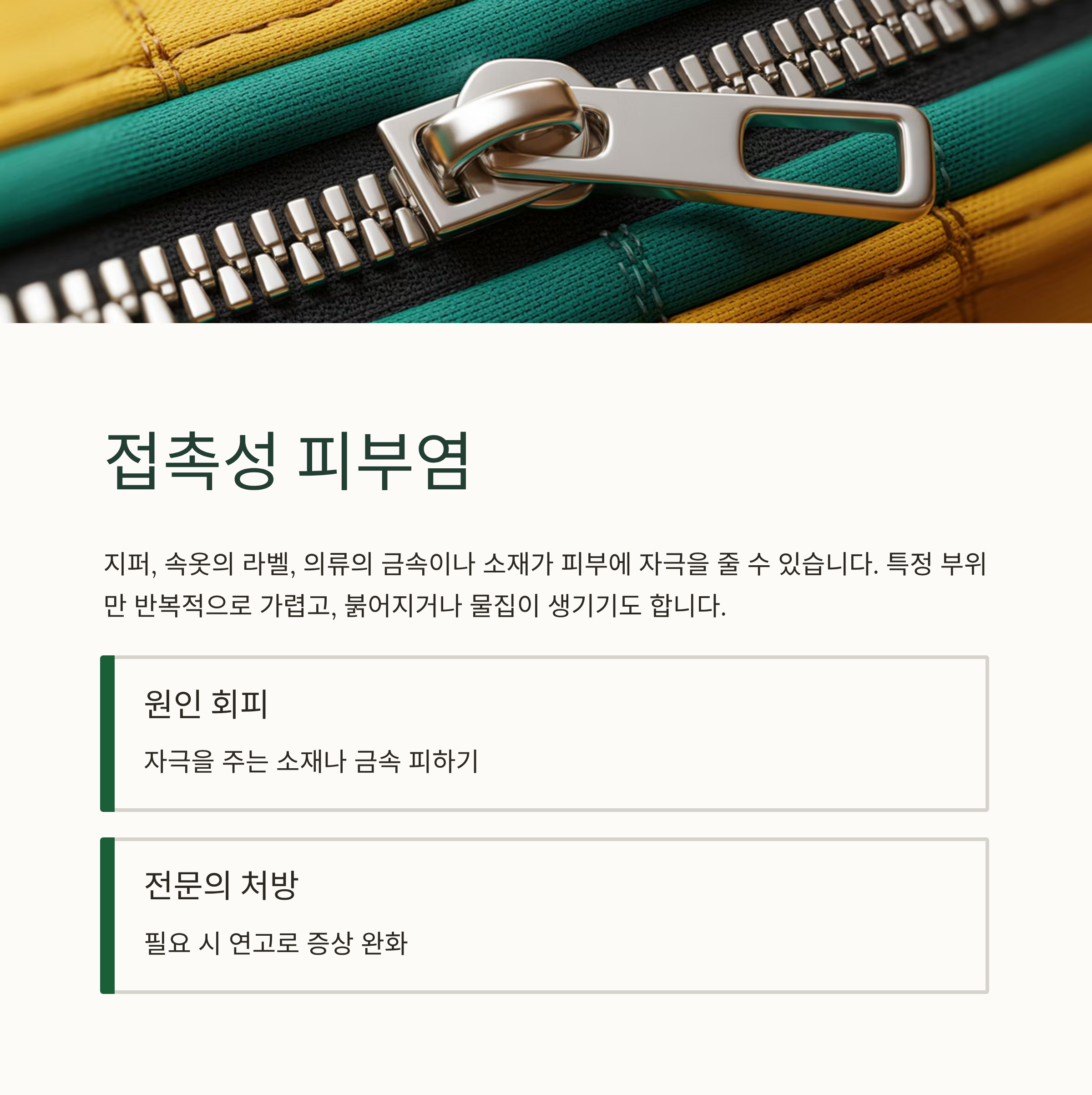 | 접촉성 피부염 | 국소 발진, 자극 부위 명확 | 외부 자극 (지퍼 등) |