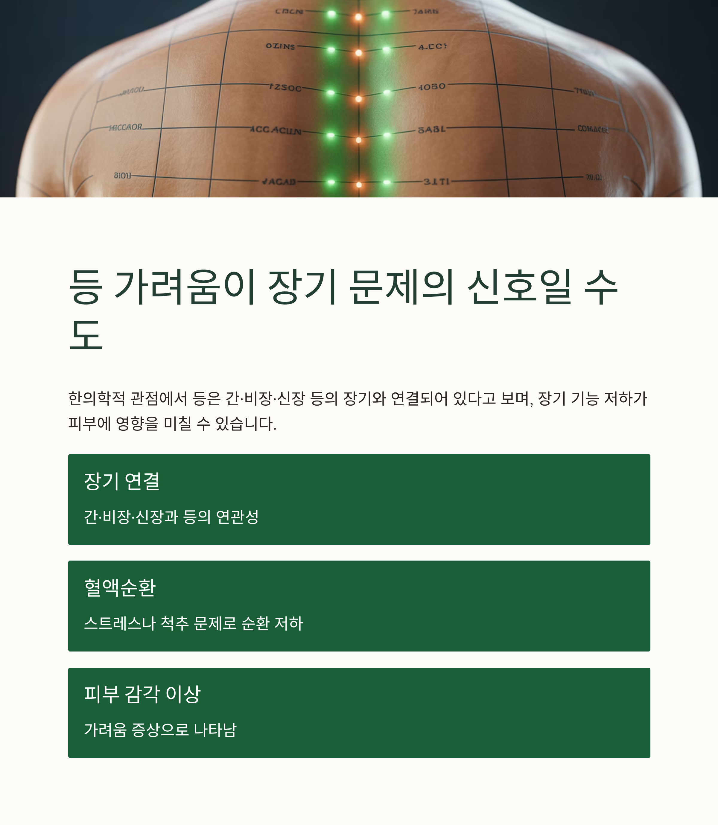 한의학적 관점에서 등은 간·비장·신장 등의 장기와 연결되어 있다고 보며, 장기 기능 저하가 피부에 영향을 미칠 수 있다고 여깁니다.