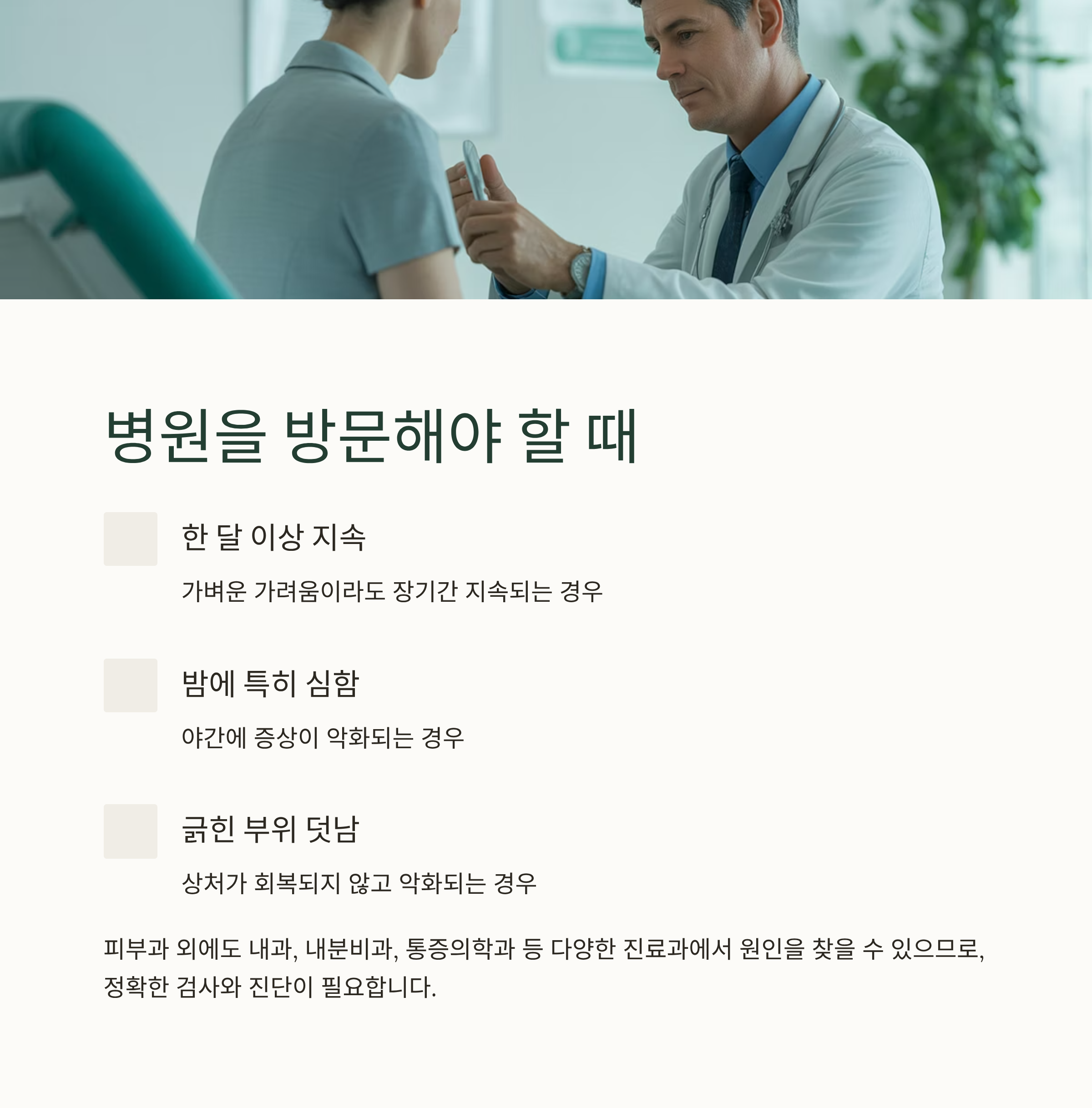 가벼운 가려움이라도 한 달 이상 지속되거나, 밤에 특히 심해지는 경우, 또는 긁힌 부위가 덧나는 경우에는 전문의의 진료를 받는 것이 중요합니다.