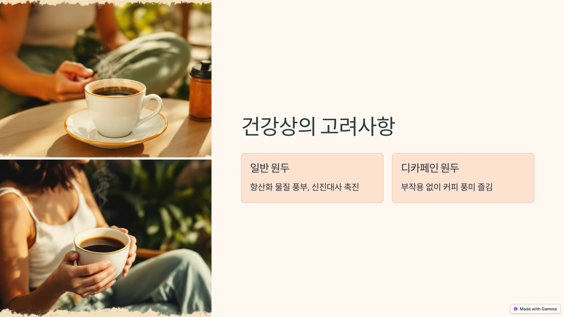 디카페인 원두는 이러한 부작용 없이 커피의 풍미를 즐길 수 있는 대안으로, 카페인 섭취를 줄이고자 하는 사람들에게 적합합니다. 특히 임산부나 특정 약물을 복용 중인 사람들은 디카페인 커피를 선호할 수 있습니다. 카페인으로 인한 수면 방해를 피하면서도 커피의 맛을 즐기고 싶을 때 디카페인 커피는 훌륭한 선택이 될 수 있습니다.