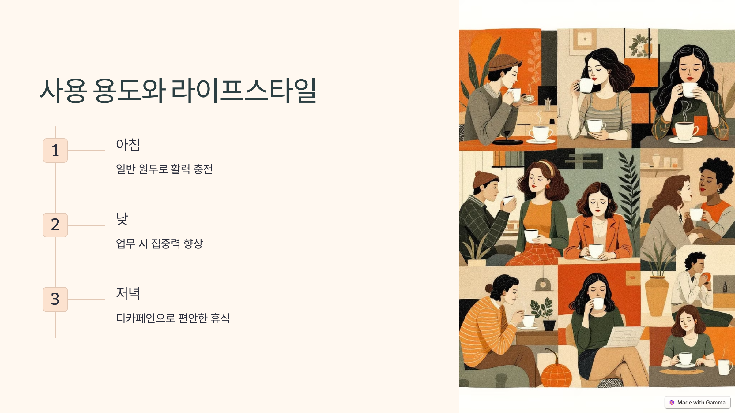 디카페인 원두와 일반 원두의 사용 용도는 개인의 라이프스타일과 취향에 따라 달라질 수 있습니다. 일반 원두는 아침이나 낮 시간에 활력을 주기 위해 많이 소비됩니다. 특히, 집중력과 에너지가 필요한 업무 시간이나 운동 전후에 적합합니다. 하루의 시작을 알리는 커피 한 잔은 많은 사람들에게 필수적인 루틴이 되었습니다.