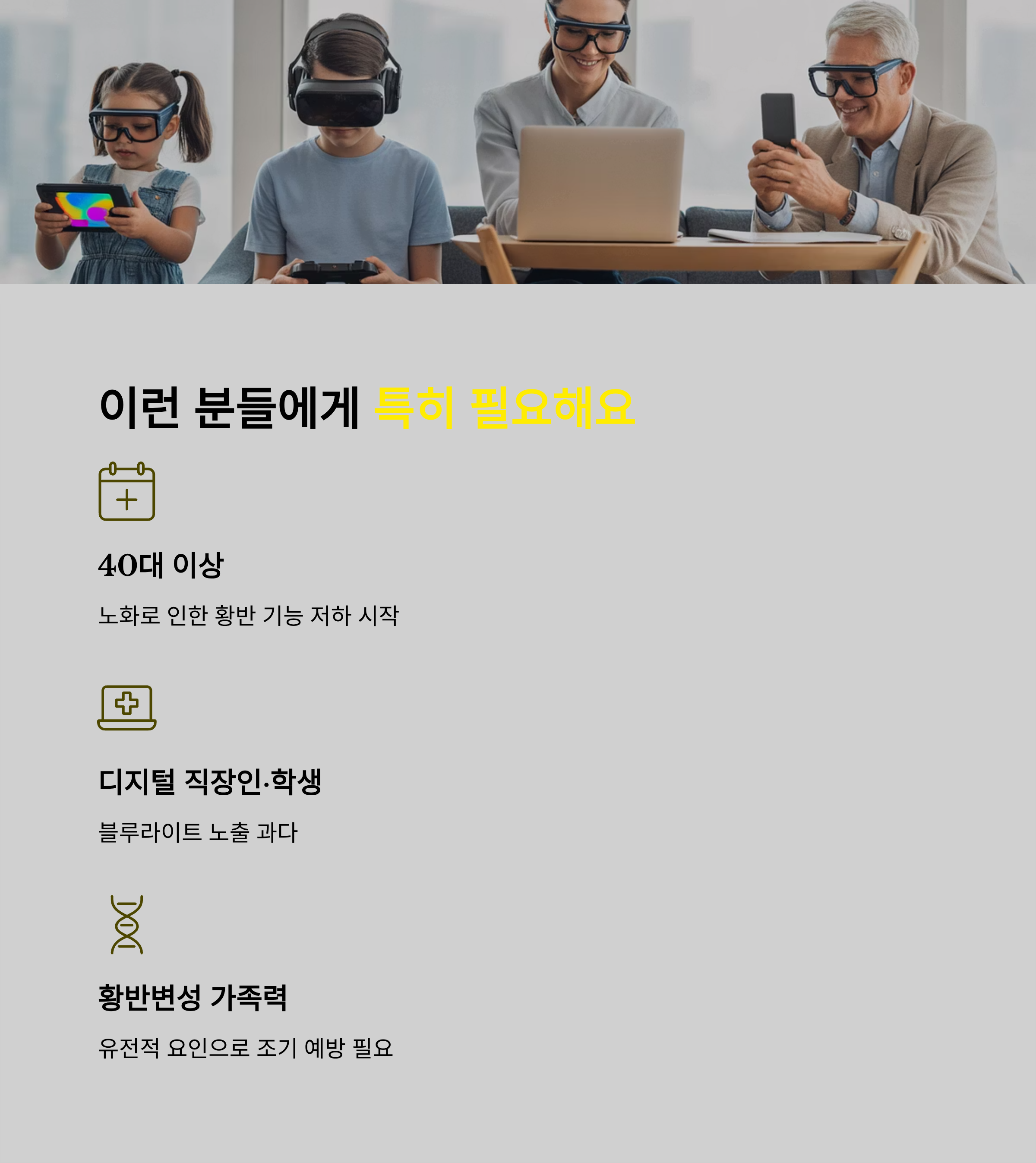 | 40대 이상 성인 | 노화로 인한 황반 기능 저하 시작 |