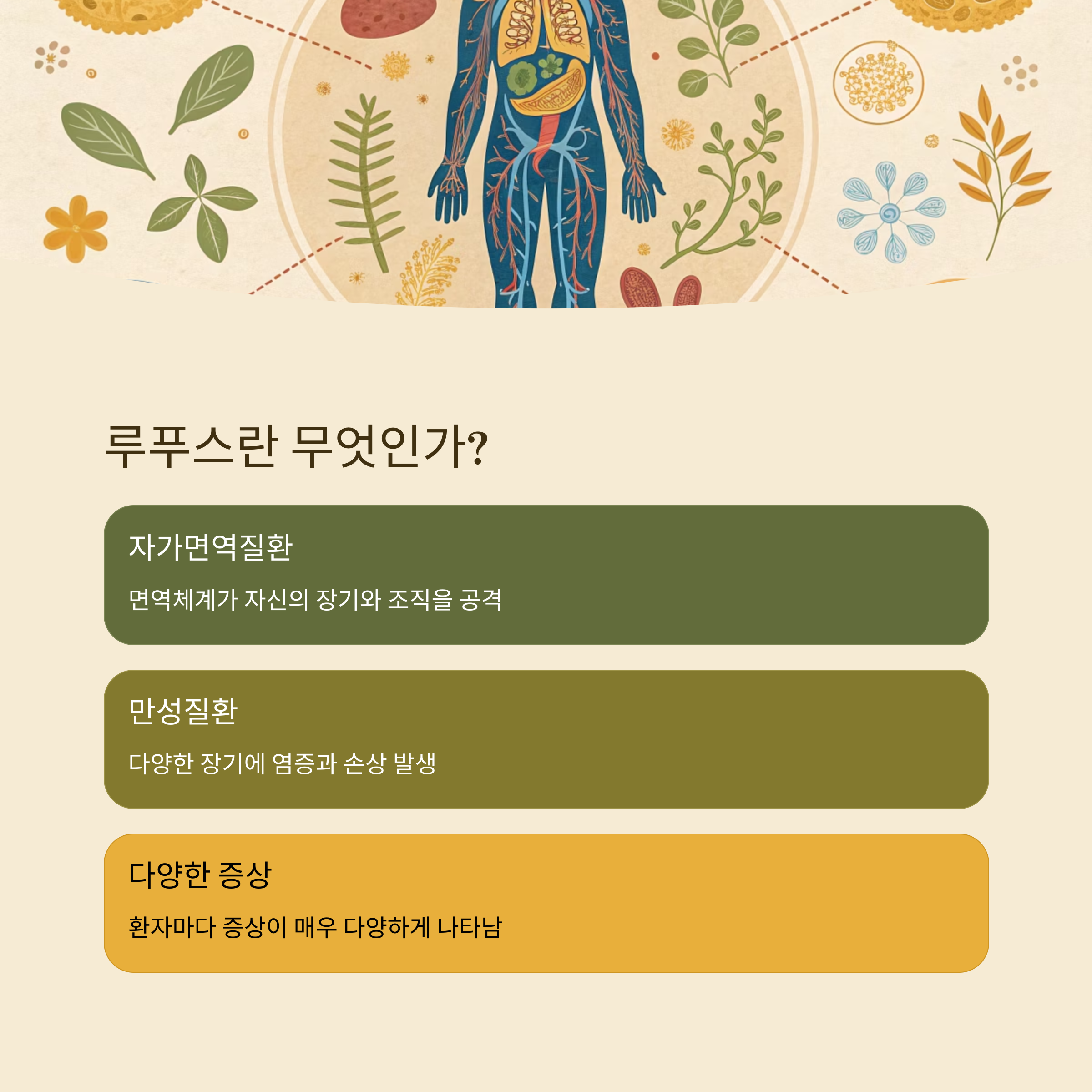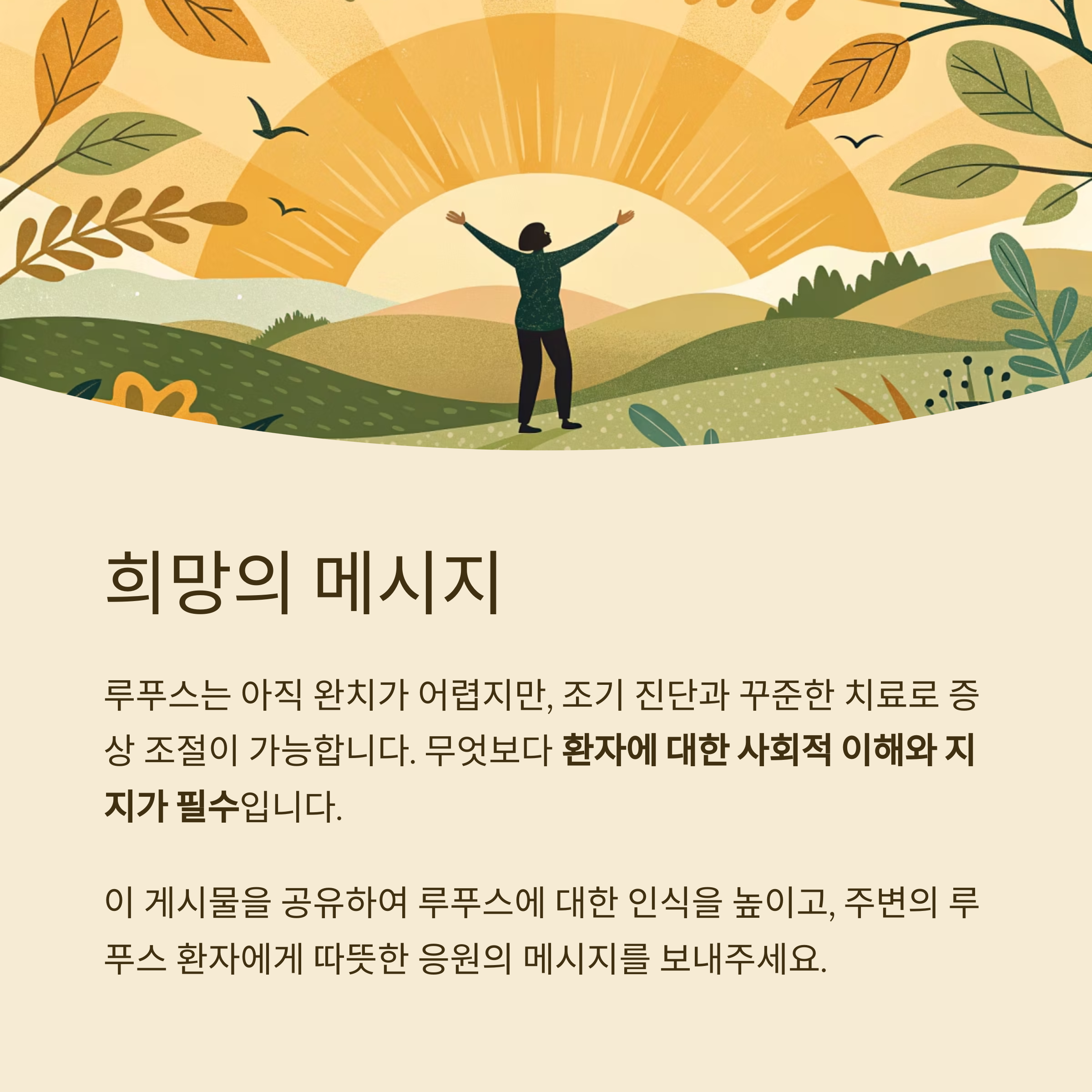 루푸스는 아직 완치가 어려운 병이지만, 조기 진단과 꾸준한 치료를 통해 증상 조절이 가능합니다.