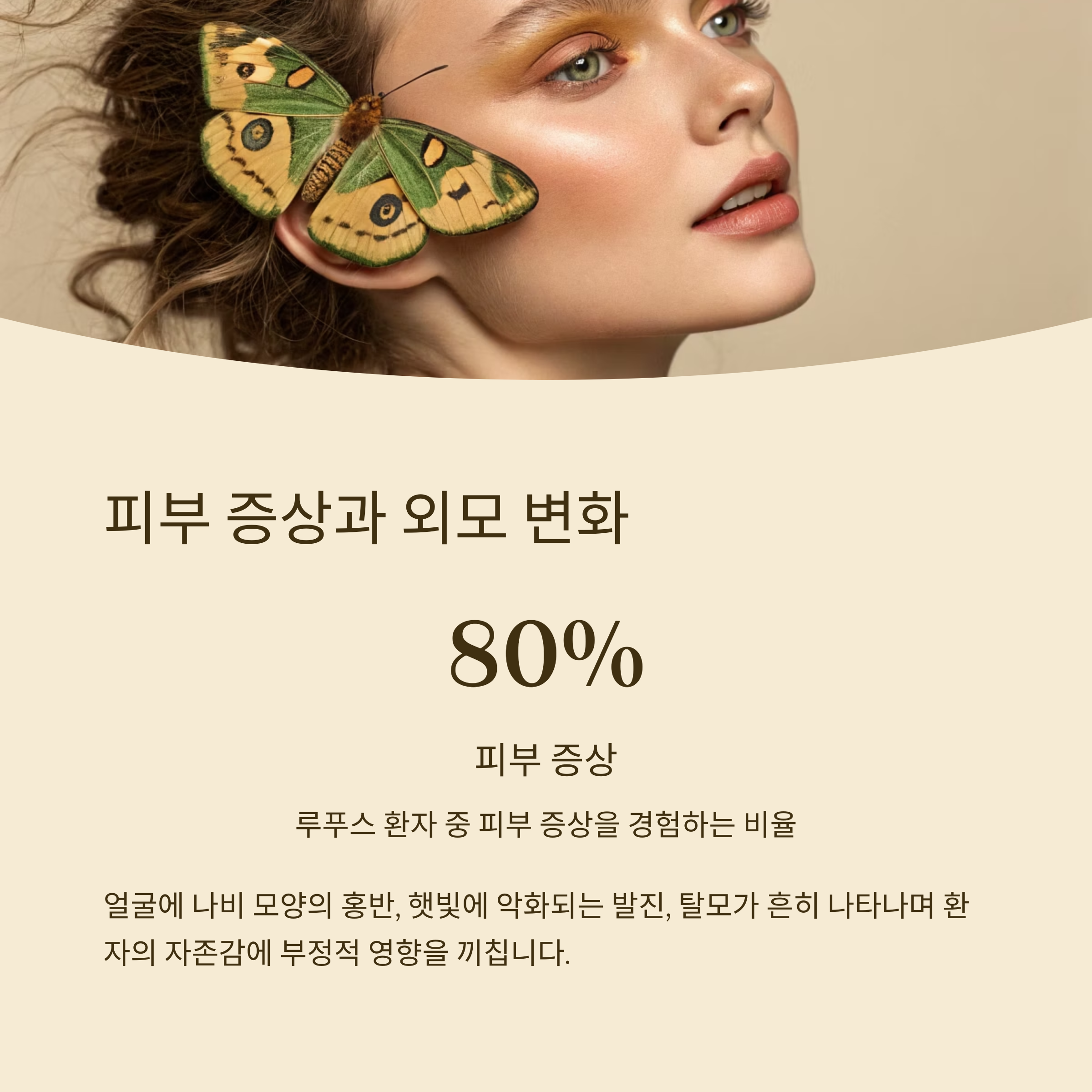대표적으로 얼굴에 나비 모양의 홍반이 생기며, 햇빛에 노출될 때 악화되는 발진과 탈모도 흔히 동반됩니다.