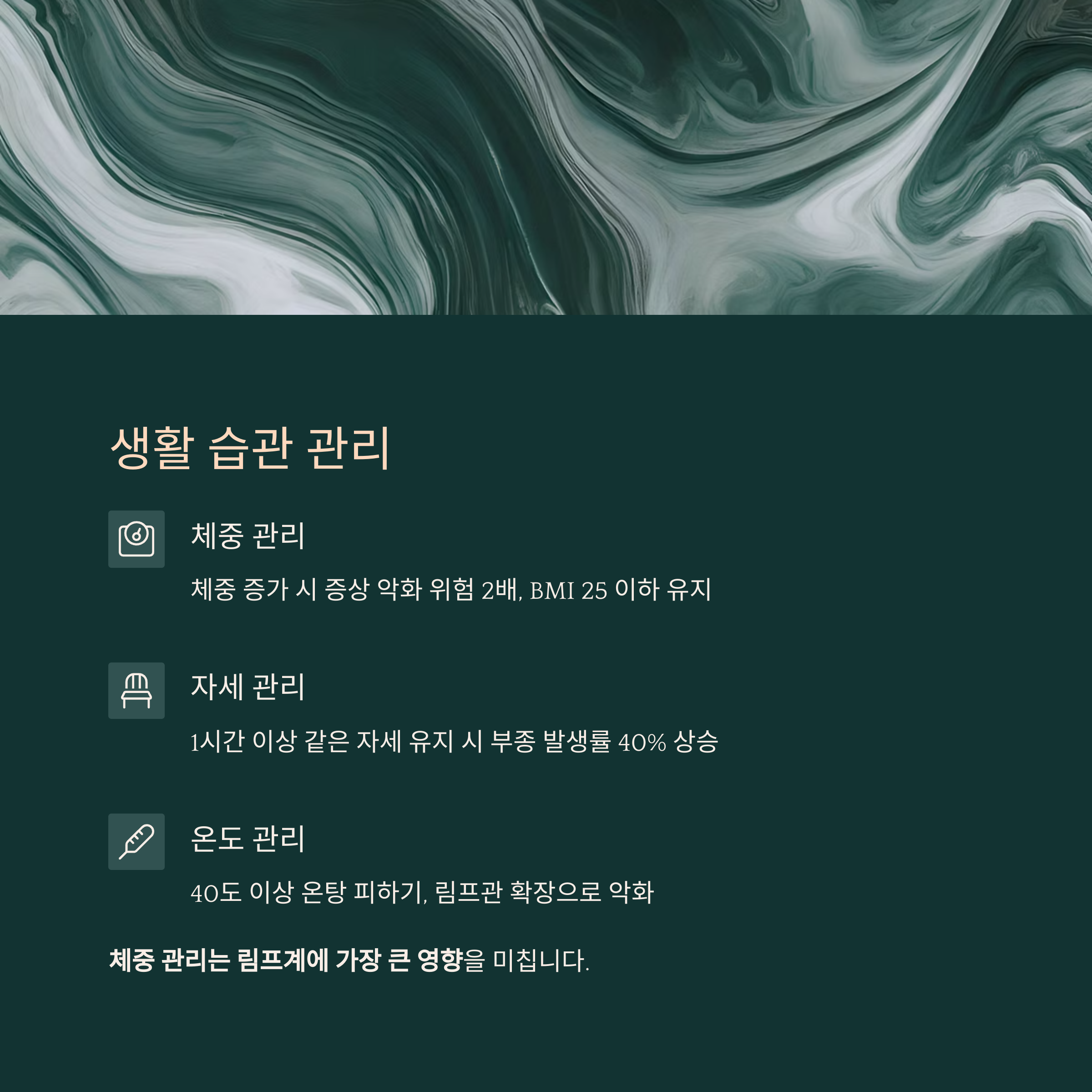림프부종은 관리 질환이므로 생활 습관이 예후에 결정적인 영향을 줍니다.