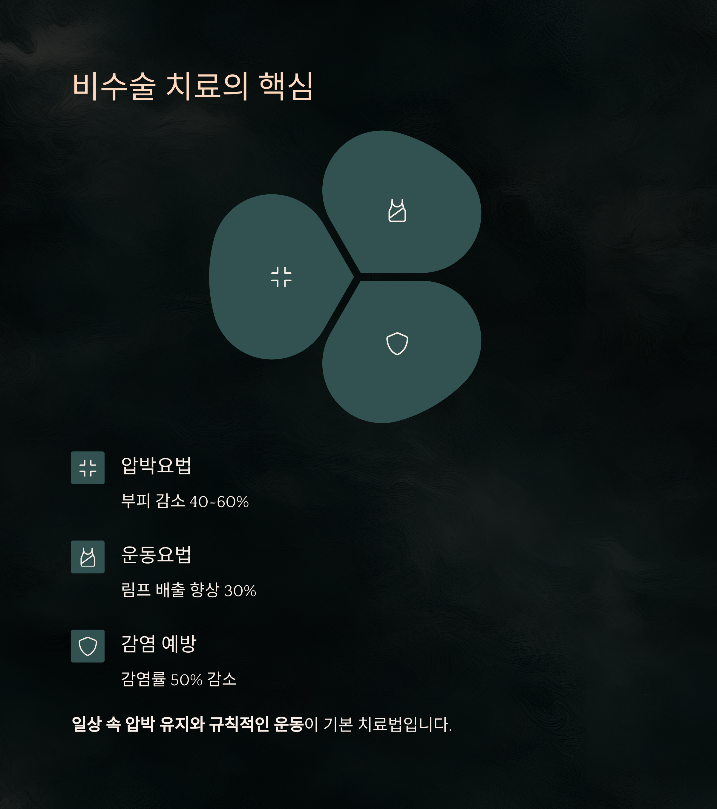압박, 운동, 감염 관리 등의 비수술 치료법이 동시에 다뤄지고 있습니다.