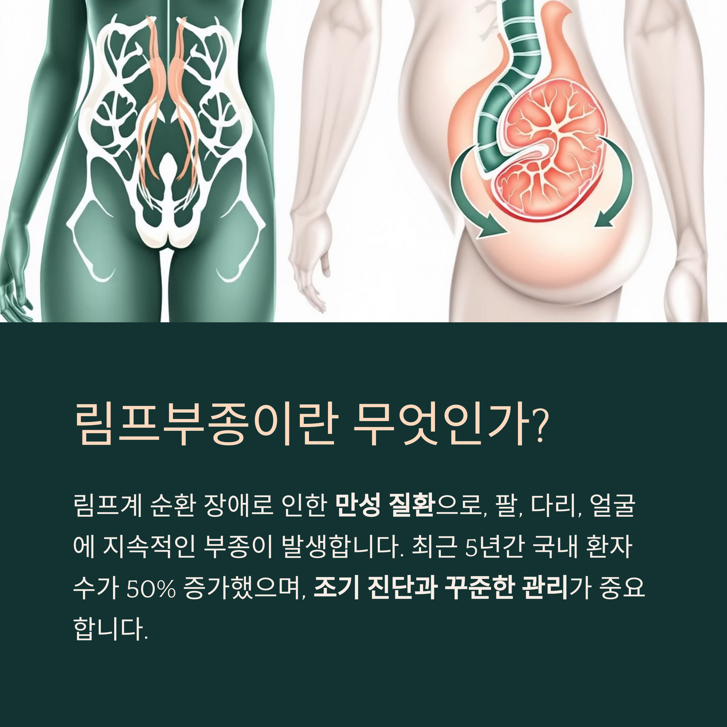 림프부종은 림프계 순환이 원활하지 않아 팔, 다리, 얼굴 등에 지속적인 부종이 발생하는 만성 질환입니다.