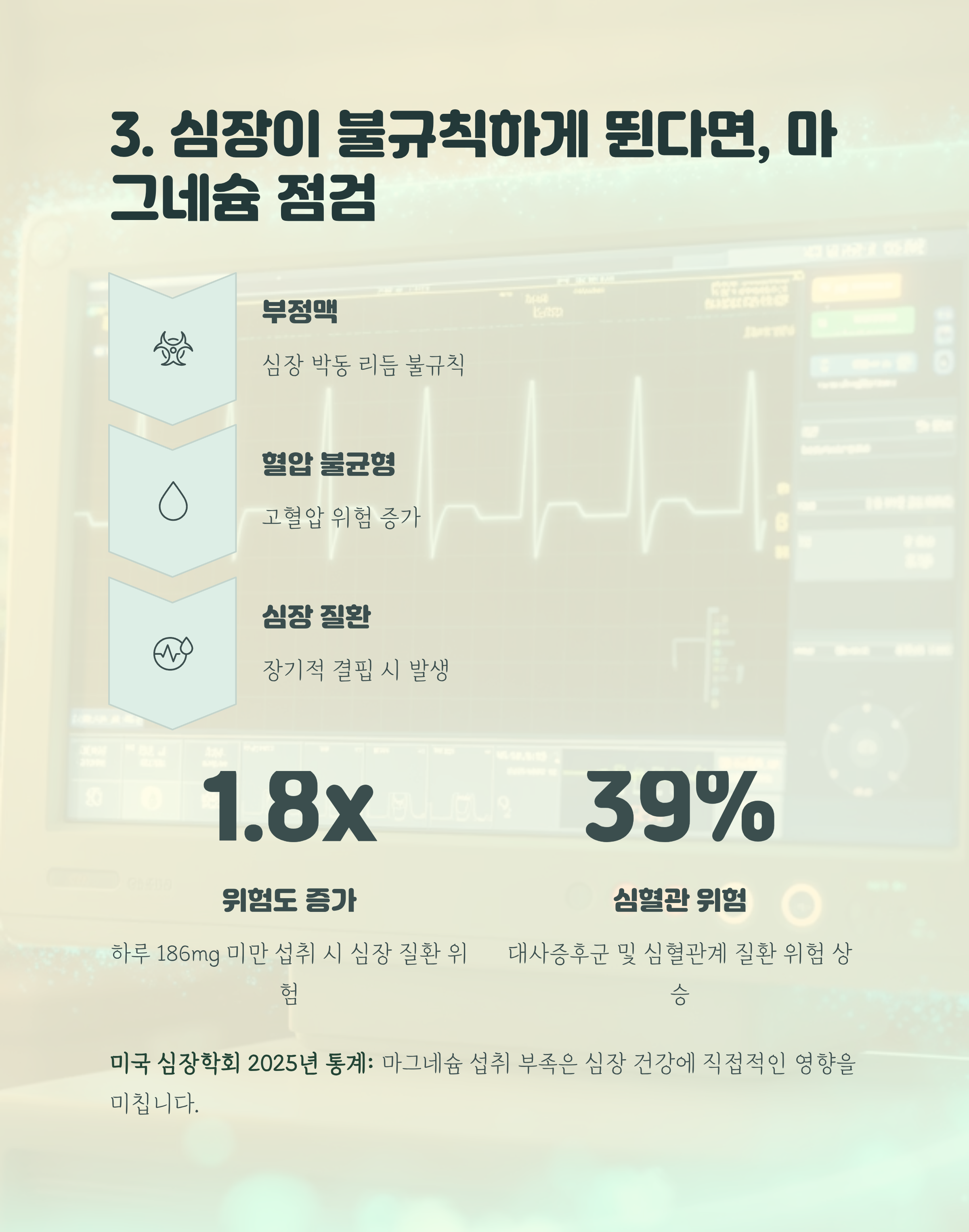 미국 심장학회에 따르면, 하루 마그네슘 섭취량이 186mg 미만인 그룹은 심장 관련 질환 위험이 정상 섭취군보다 약 1.8배 높게 나타났습니다. 특히 대사증후군과 심혈관계 질환 위험이 최대 39%까지 높아질 수 있다는 2025년 통계도 있습니다.