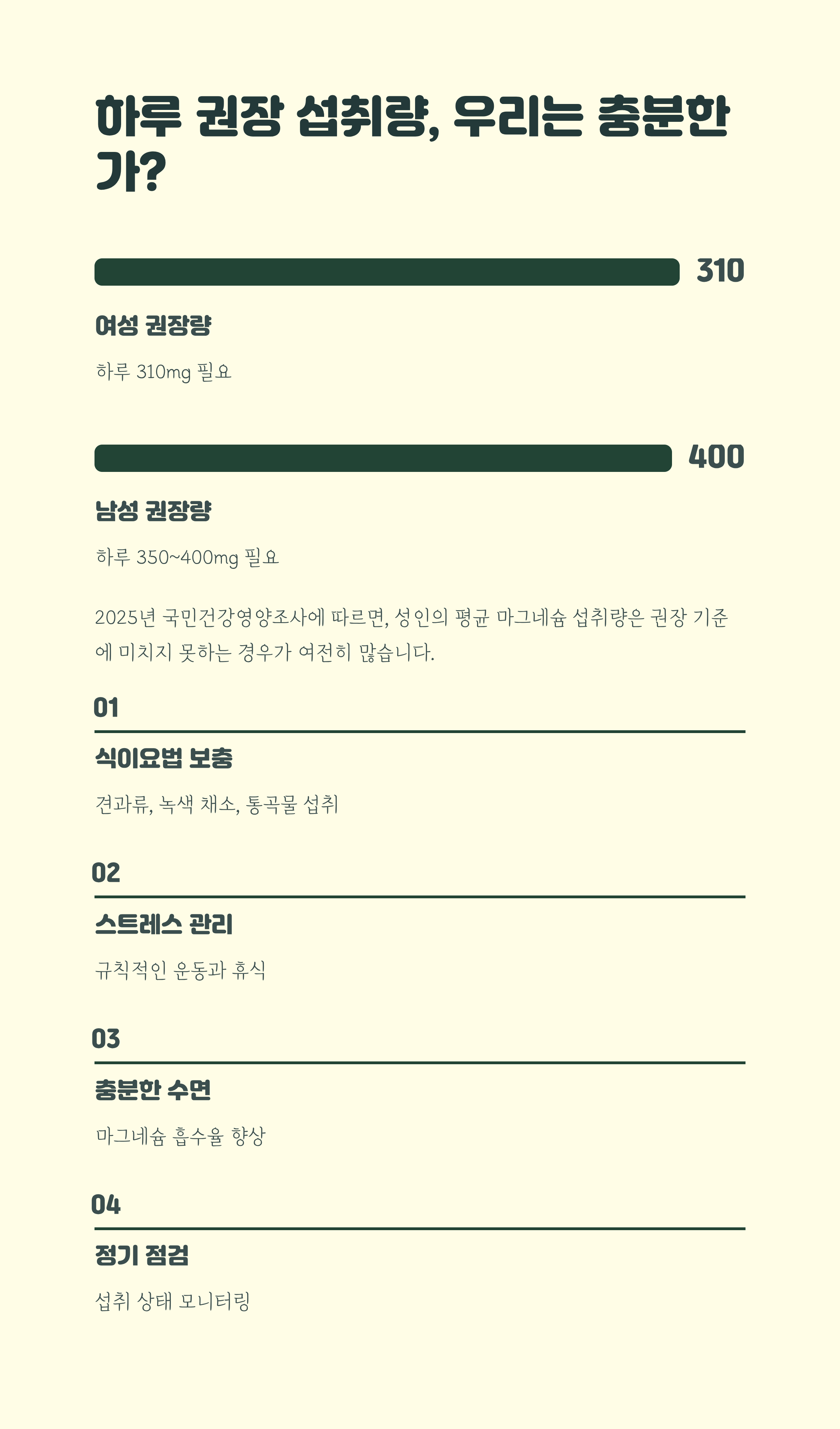 성인 기준 마그네슘의 하루 권장 섭취량은 여성 310mg, 남성 350~400mg입니다. 그러나 2025년 국민건강영양조사에 따르면, 성인의 평균 마그네슘 섭취량은 권장 기준에 미치지 못하는 경우가 여전히 많습니다.