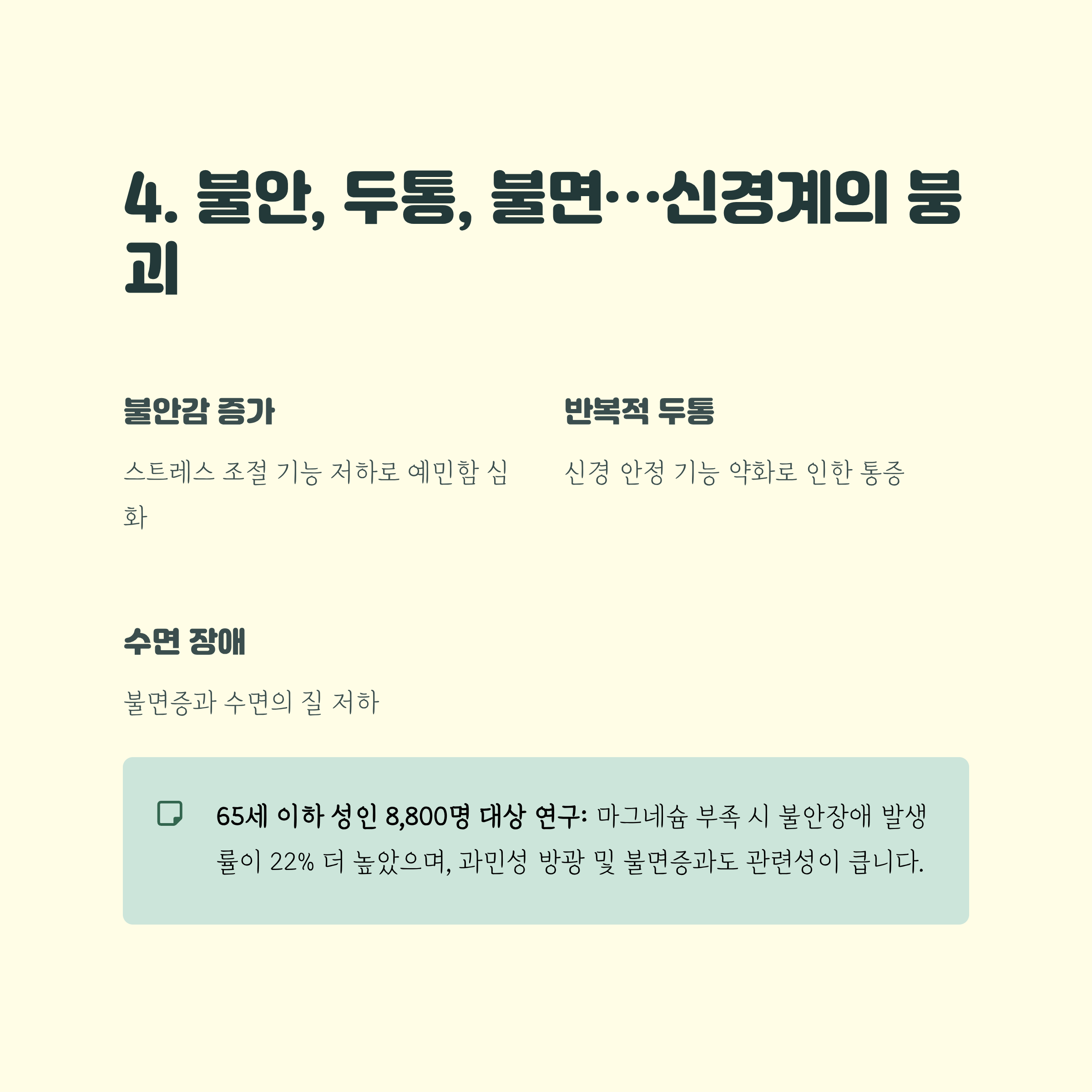 마그네슘은 뇌 신경 안정과 스트레스 조절에도 관여합니다. 이 성분이 부족하면 불안감, 예민함, 두통, 수면 장애 같은 증상이 반복적으로 나타날 수 있습니다.