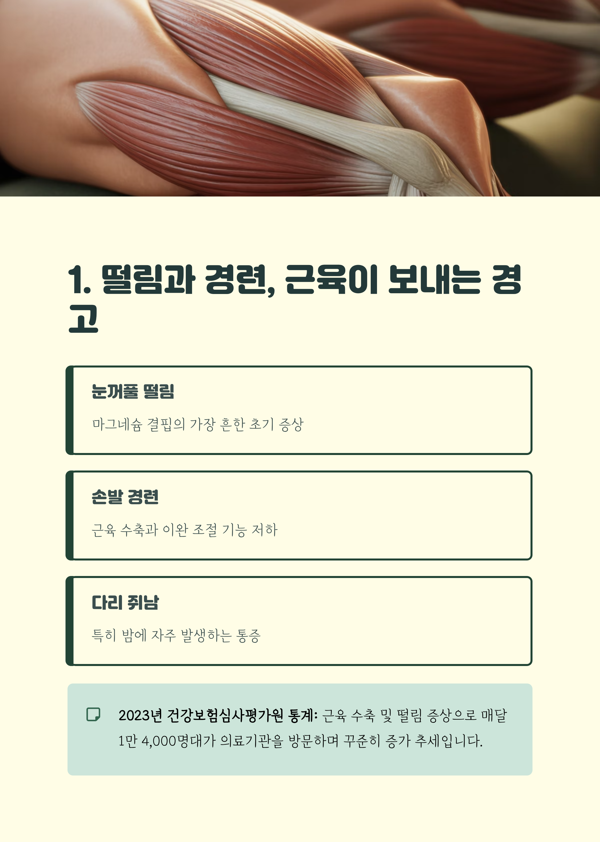 2023년 건강보험심사평가원 통계에 따르면, 근육 수축 및 떨림 증상으로 의료기관을 찾는 환자가 매달 1만 4,000명대에 달하며 꾸준히 증가하는 추세입니다. 이는 단순 피로가 아닌 마그네슘 결핍의 신호일 수 있습니다.