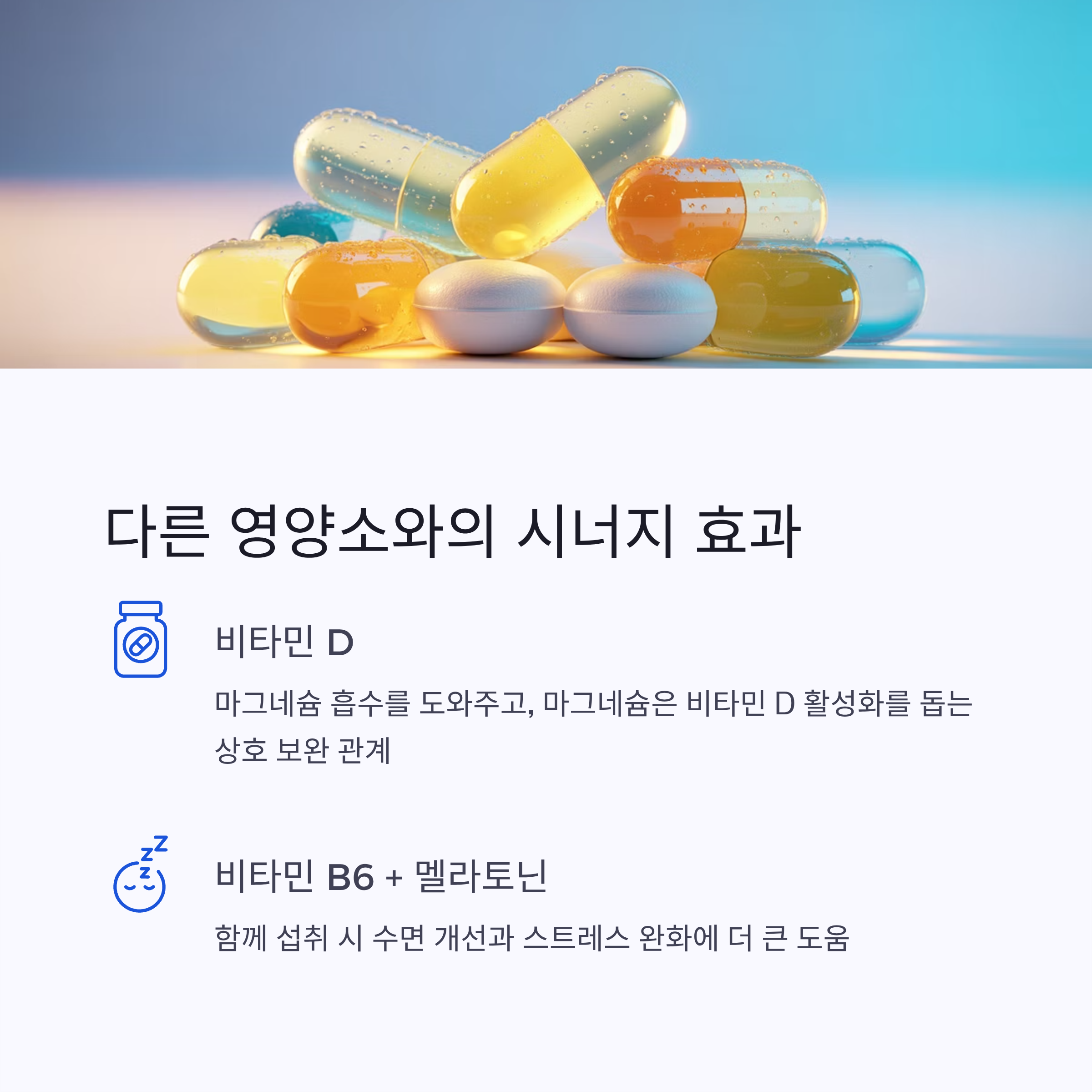 또한, 비타민 B6나 멜라토닌과 함께 섭취할 경우 수면 개선이나 스트레스 완화에도 더 큰 도움이 됩니다.