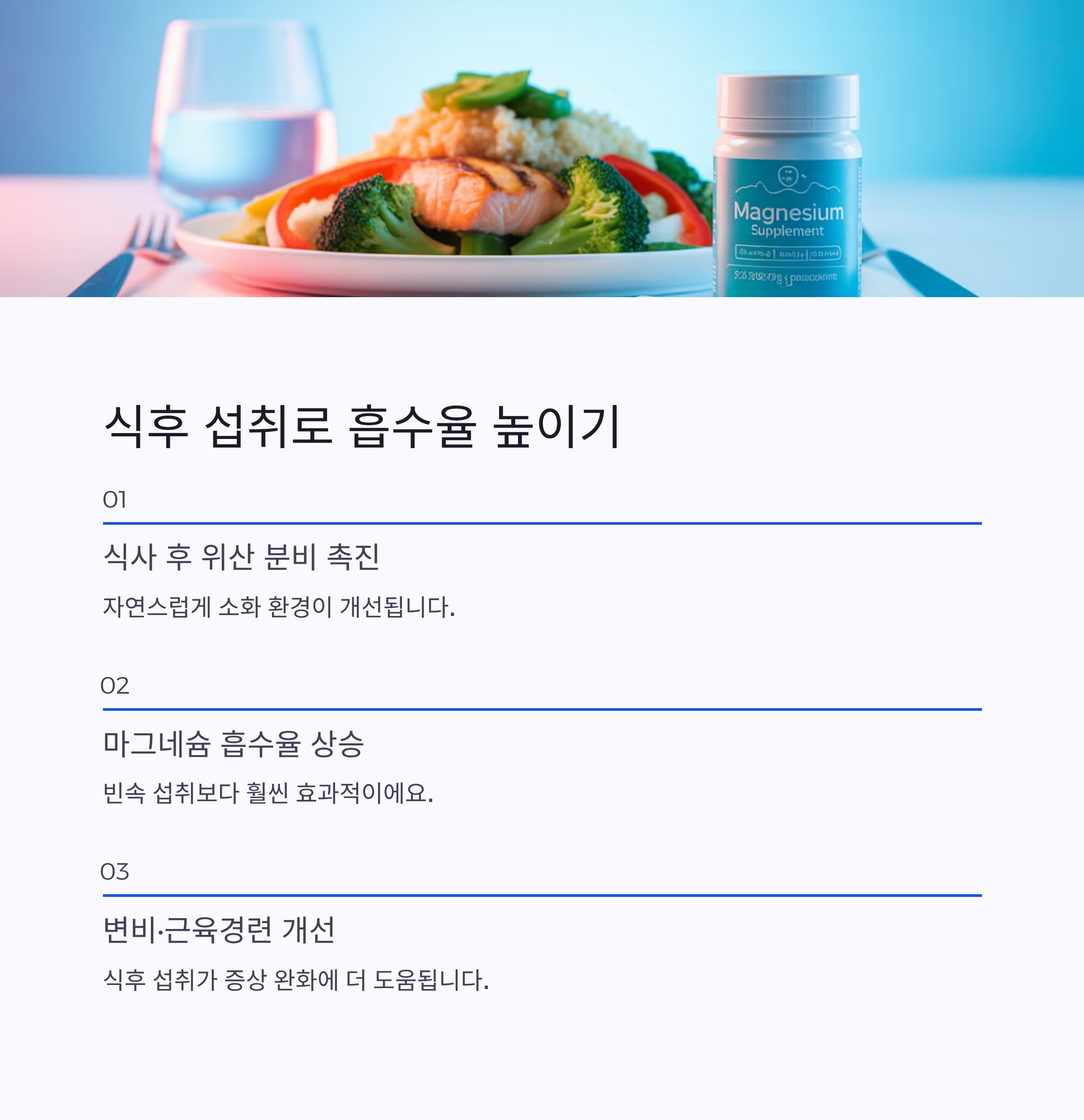 식사를 통해 자연스럽게 위산 분비가 촉진되면서 마그네슘의 흡수율이 올라가기 때문인데요, 특히 변비나 근육 경련 등을 개선하고자 한다면 식후 섭취가 훨씬 효과적일 수 있습니다.