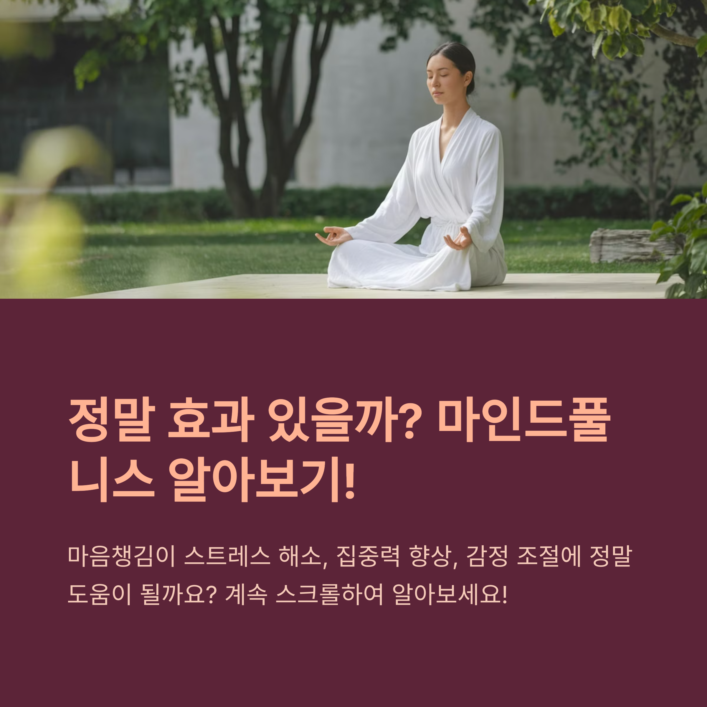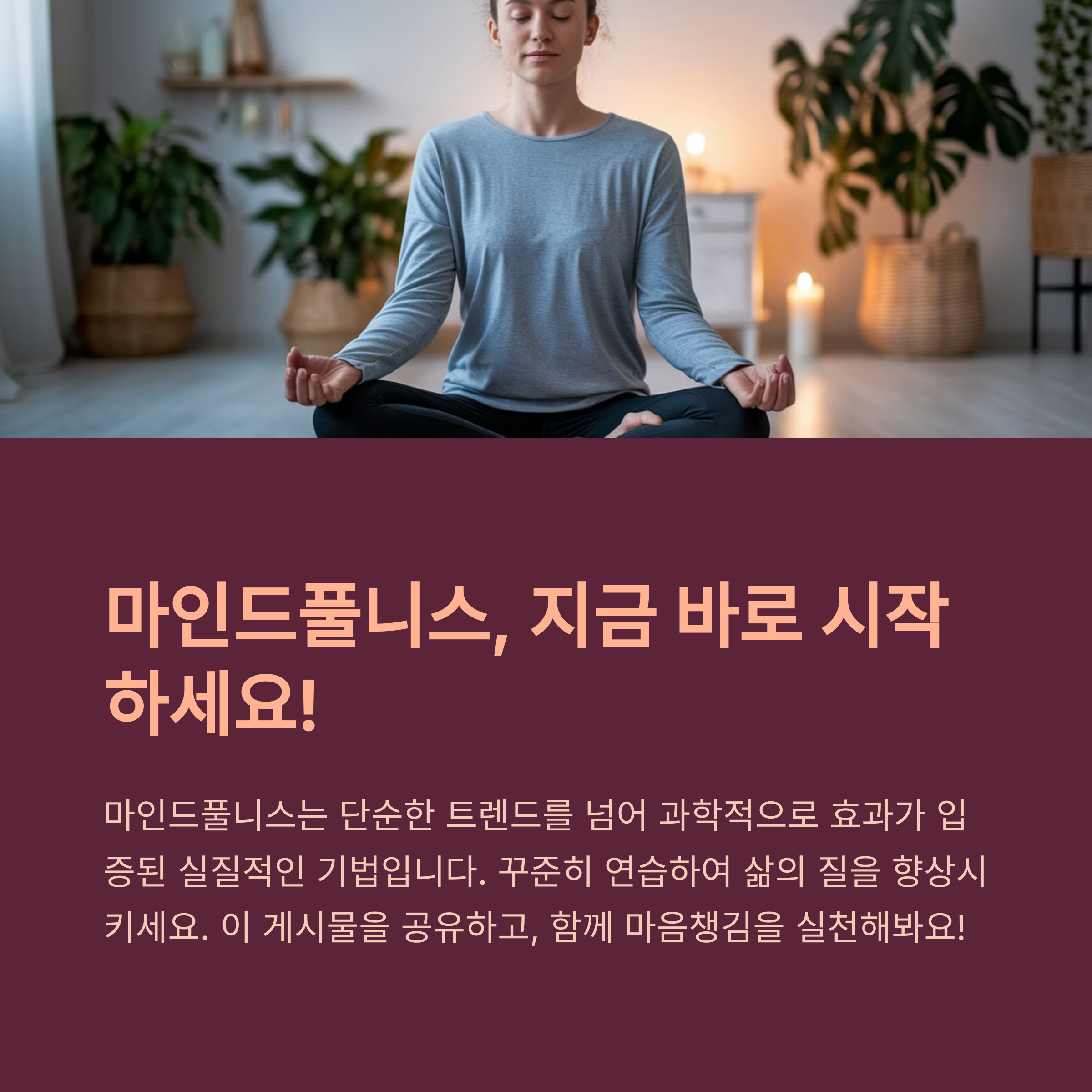 마인드풀니스는 단순한 트렌드가 아니라, 과학적으로 검증된 실천법입니다. 짧은 시간 동안이라도 꾸준히 실천하면 정신적 안정, 집중력 향상, 스트레스 감소 등의 효과를 직접 경험할 수 있습니다. 하루 5분만이라도 마인드풀니스 명상을 실천하며 작은 변화를 시작해보는 것은 어떨까요?
