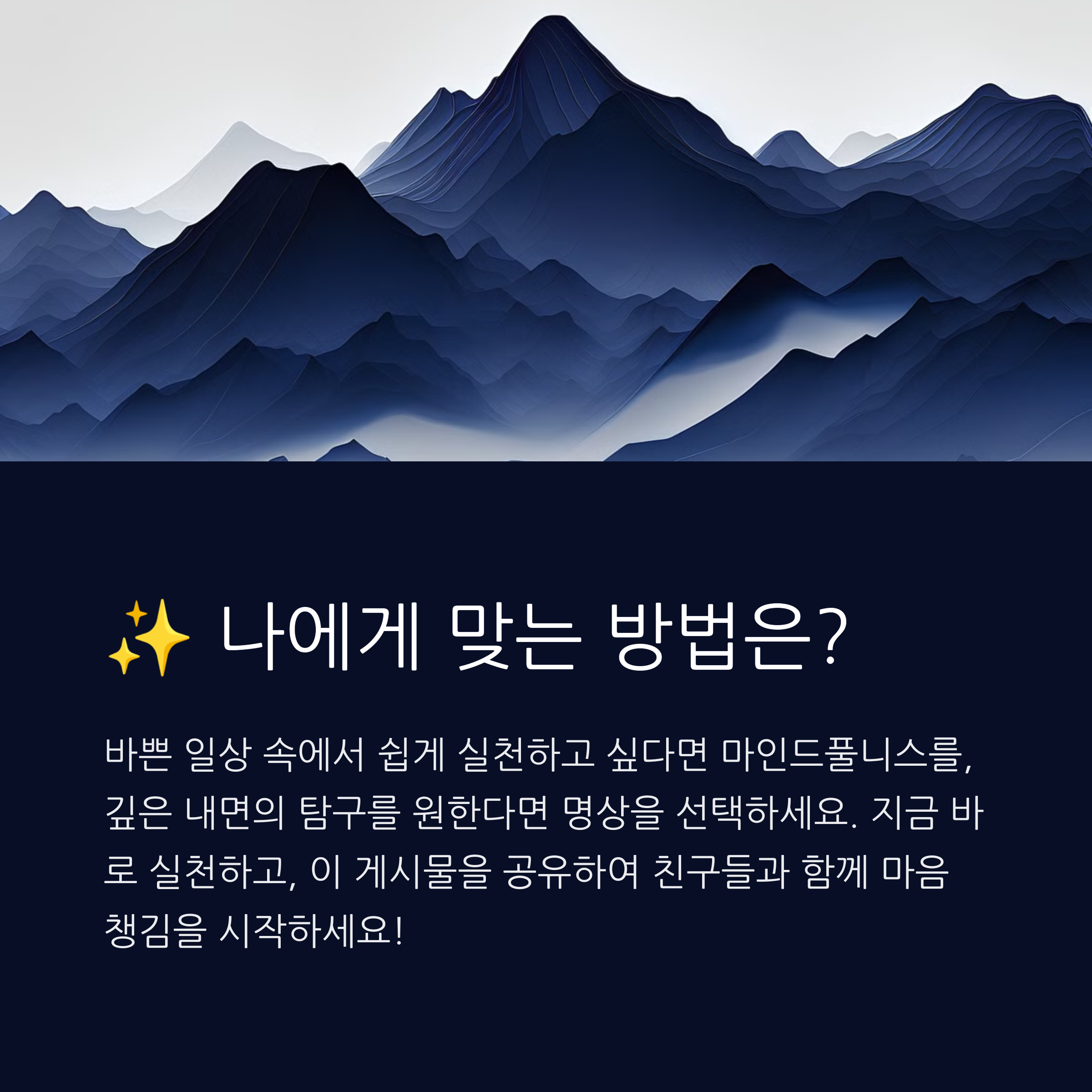 마인드풀니스와 명상 중 어떤 방법이 더 잘 맞을 것 같나요? 여러분의 경험을 댓글로 공유해주세요!
