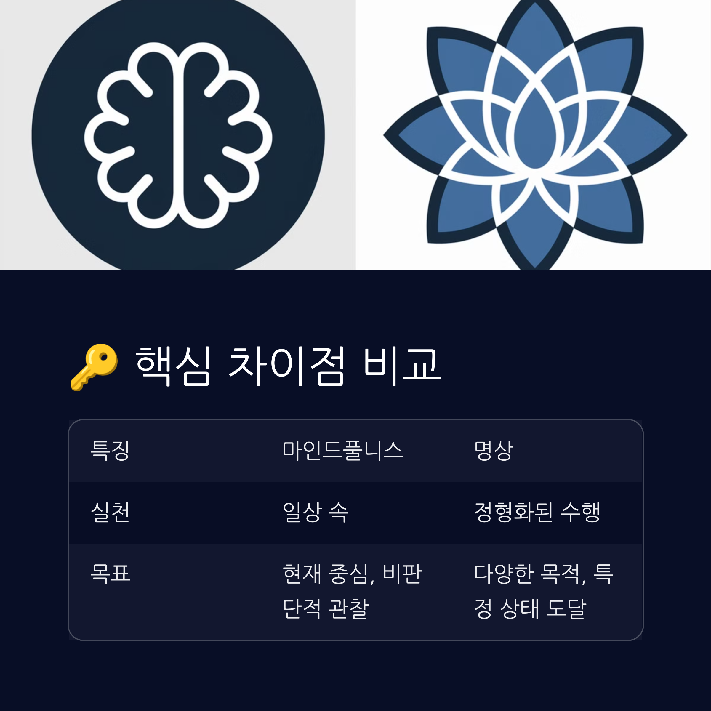 마인드풀니스와 명상의 차이점을 비교하면 마인드풀니스는 일상에서도 쉽게 실천할 수 있는 반면, 명상은 특정한 시간과 장소에서 보다 깊은 집중이 필요합니다. 또한 명상은 다양한 방식으로 수행되지만, 마인드풀니스는 현재 순간을 있는 그대로 받아들이는 연습이라는 점에서 차별점이 있습니다.