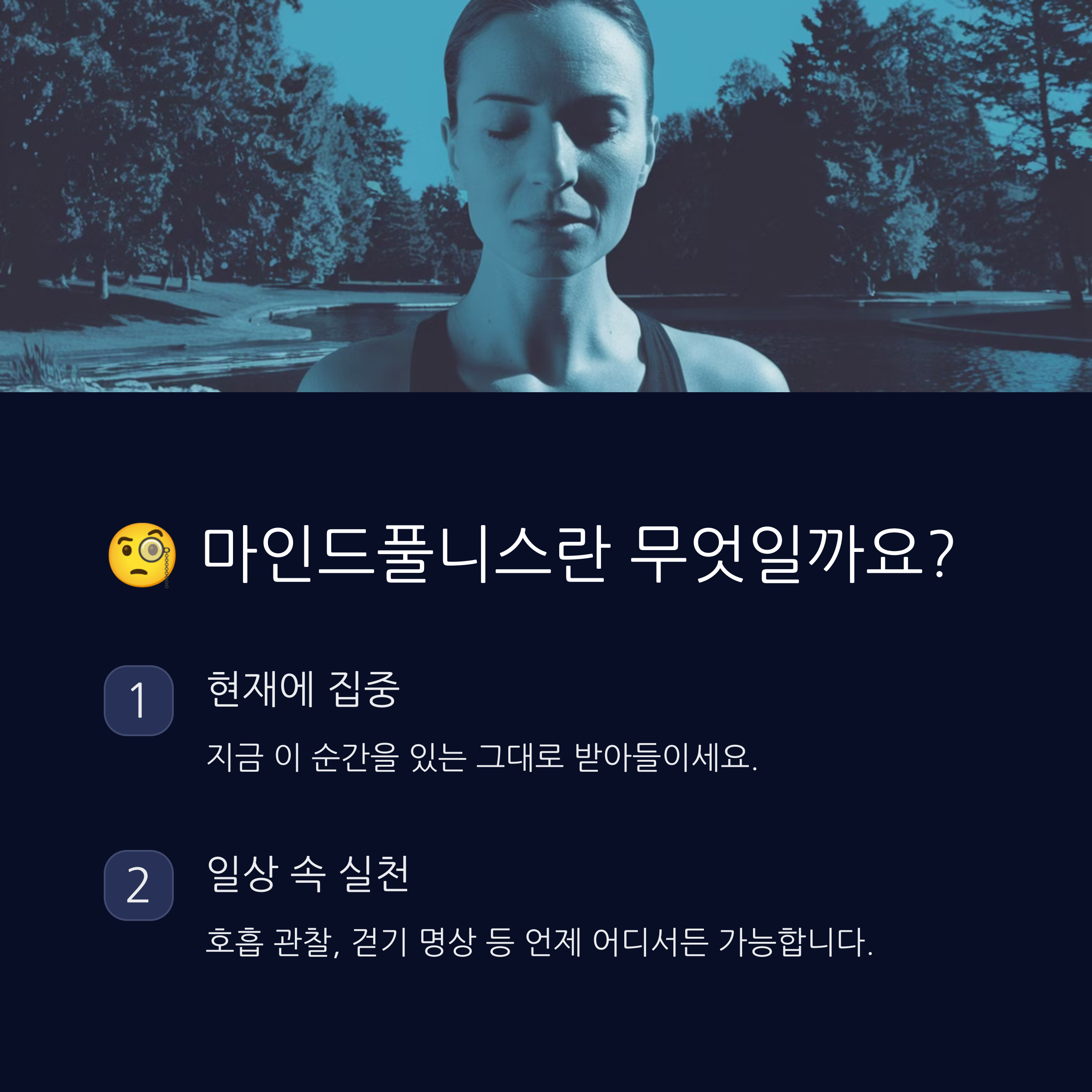 | 현재 순간에 집중하는 연습 | 내면의 평화와 집중력 향상을 위한 수행 | 마인드풀니스는 일상에서도 실천 가능 |
