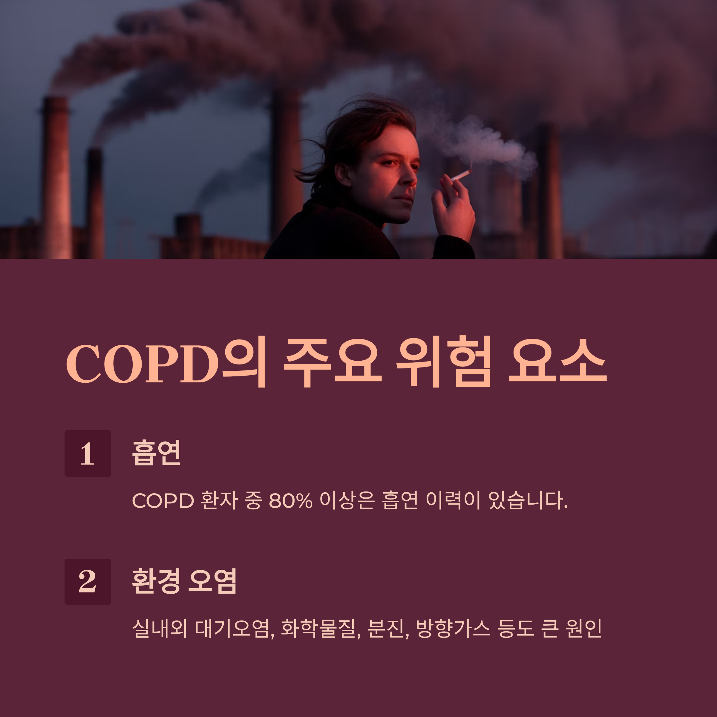 COPD 환자 중 80% 이상은 흡연 이력이 있습니다. 이 외에도 실내외 대기오염, 화학물질, 분진, 방향가스 등도 큰 원인이 되죠. 특히 공장 근무자, 미세먼지 노출이 잦은 환경에 있는 사람들은 더 주의해야 합니다.