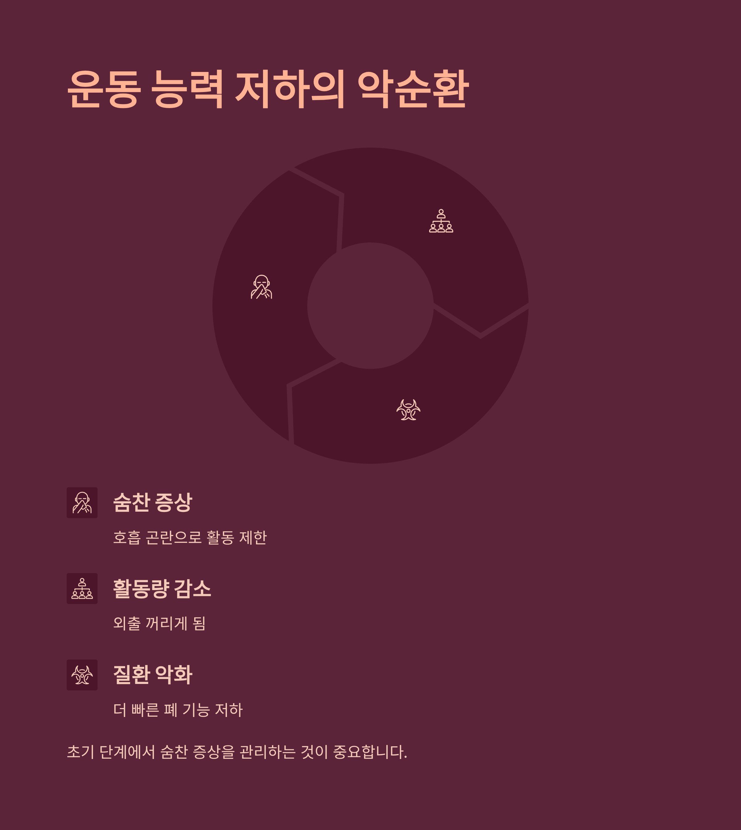 숨이 찬 증상이 계속되면 점점 움직이기가 힘들어지고 체력도 떨어져요. 나중에는 단순한 외출조차 꺼리게 됩니다. 이런 상태가 반복되면 악순환이 되어, 질환이 더 빠르게 악화됩니다. 초기 단계에서 숨찬 증상을 관리하는 것이 중요합니다.