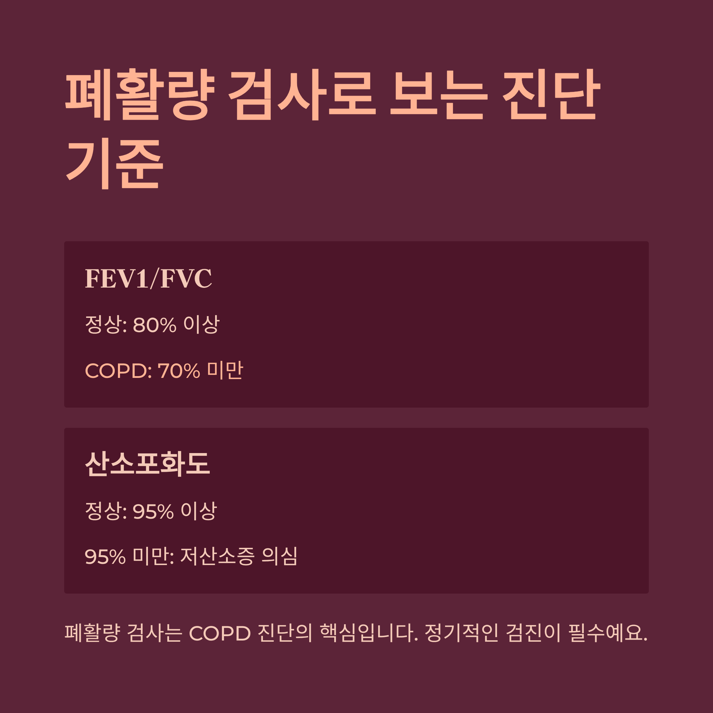 폐활량 검사(FVC, FEV1)는 COPD 진단의 핵심입니다. 특히 FEV1/FVC 비율이 70% 미만이면 COPD로 판단합니다. 이 수치는 치료 여부, 진행 속도에 따라 계속 달라질 수 있으므로 정기적인 검진이 필수예요.