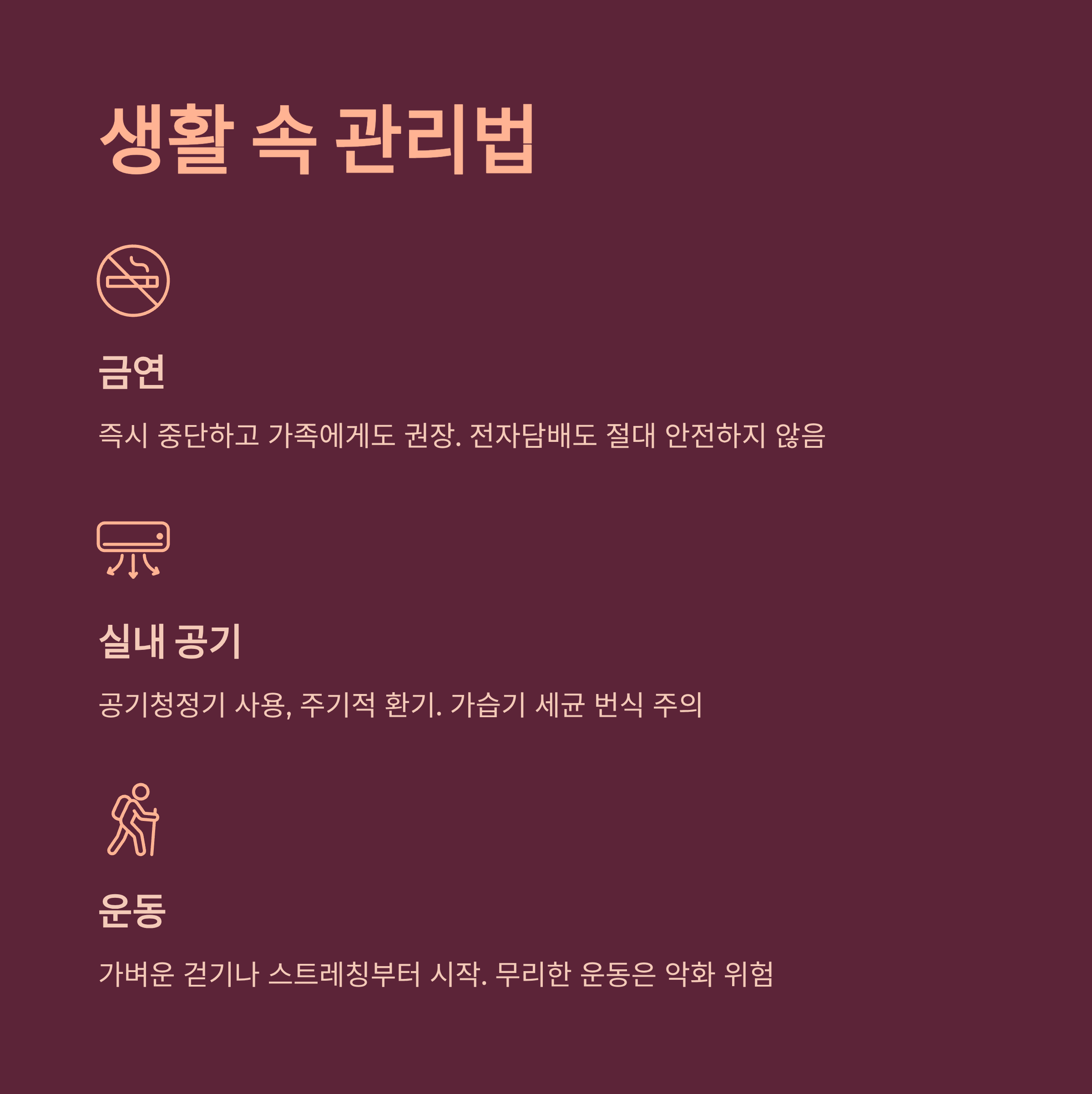 | 금연 | 즉시 중단, 가족에게도 권장 | 전자담배도 절대 안전하지 않음 |