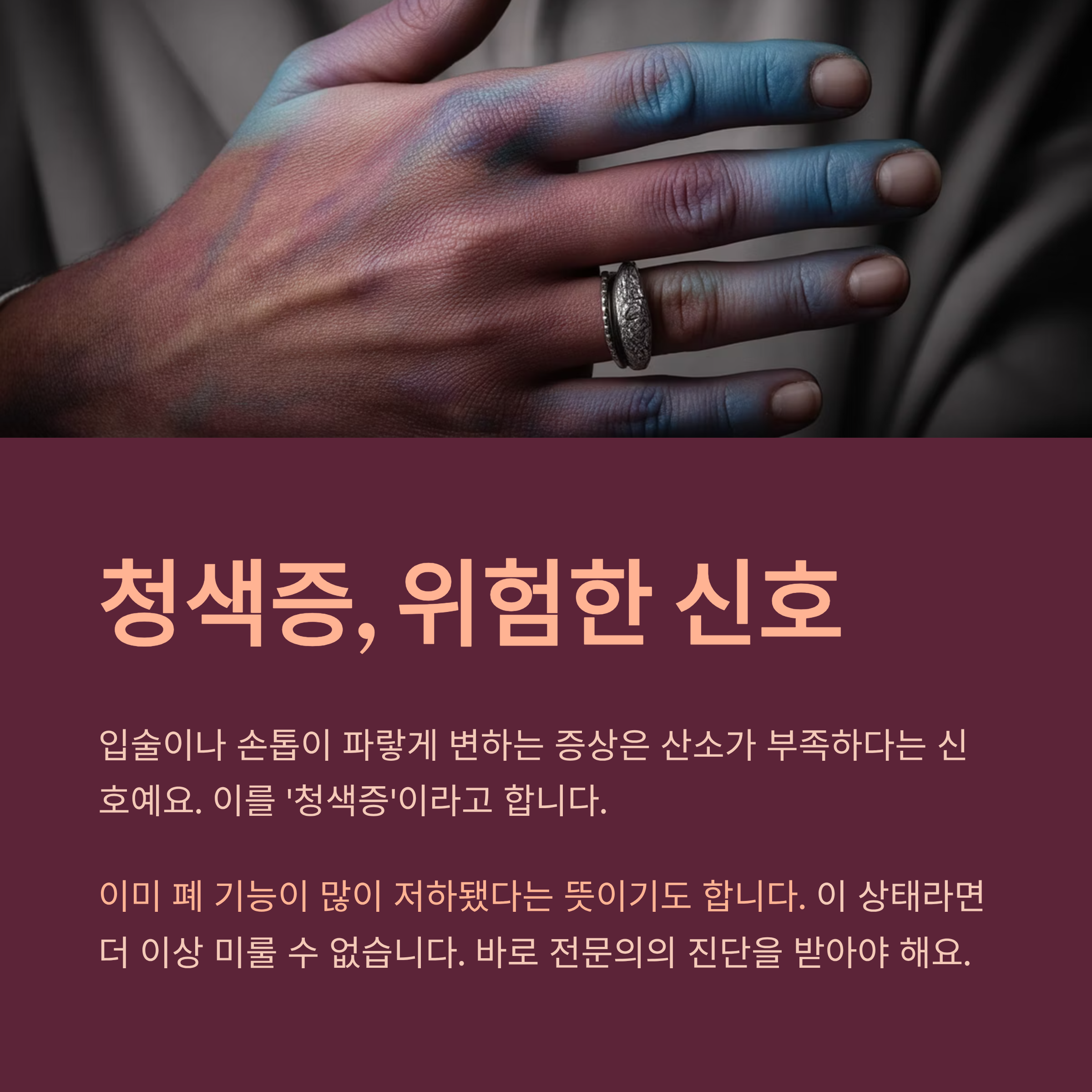 입술이나 손톱이 파랗게 변하는 증상은 산소가 부족하다는 신호예요. 이를 ‘청색증’이라고 하며, 이미 폐 기능이 많이 저하됐다는 뜻이기도 합니다. 이 상태라면 더 이상 미룰 수 없습니다. 바로 전문의의 진단을 받아야 해요.