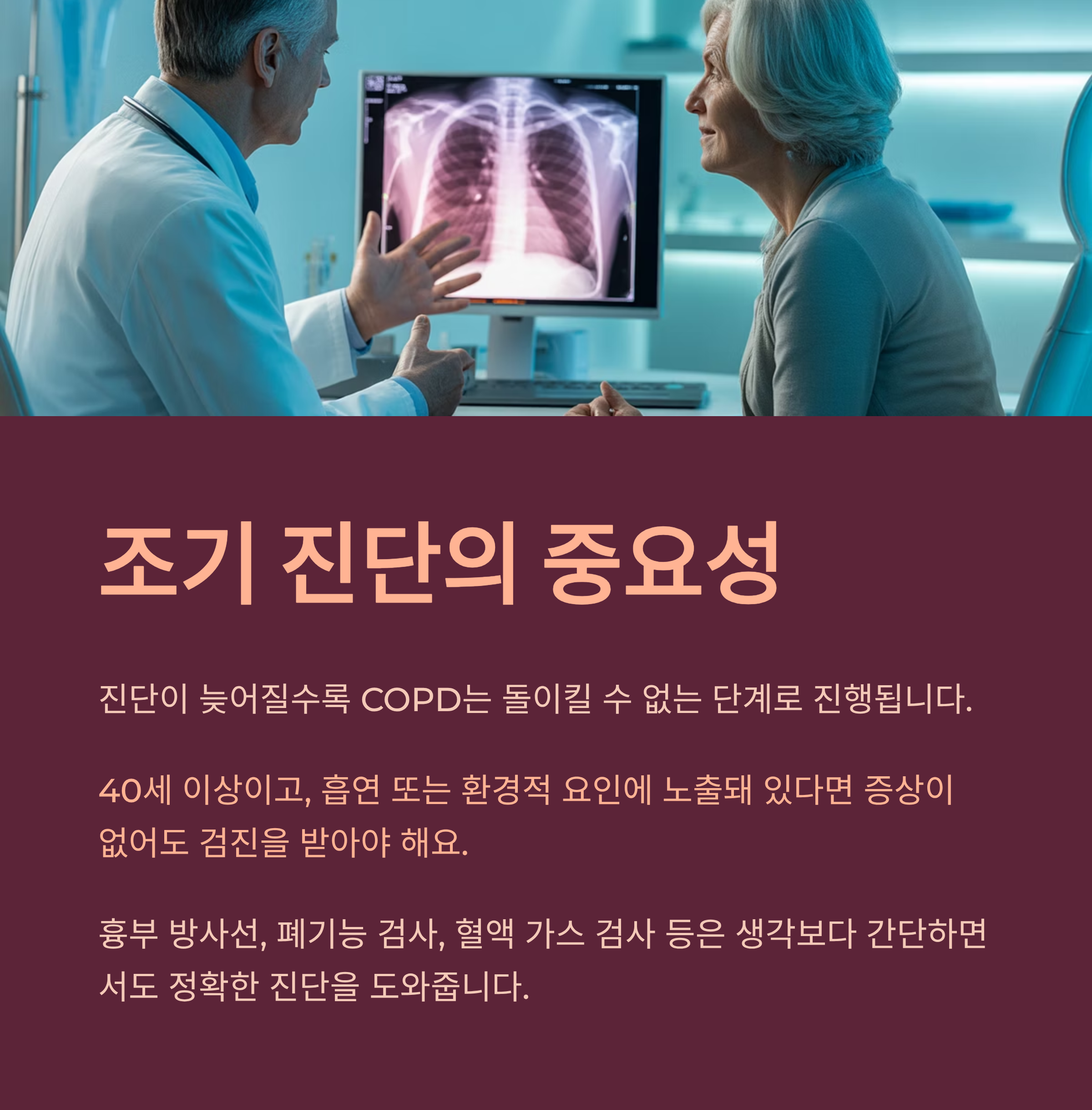 진단이 늦어질수록 COPD는 돌이킬 수 없는 단계로 진행됩니다. 특히 40세 이상이고, 흡연 또는 환경적 요인에 노출돼 있다면 증상이 없어도 검진을 받아야 해요. 흉부 방사선, 폐기능 검사, 혈액 가스 검사 등은 생각보다 간단하면서도 정확한 진단을 도와줍니다.