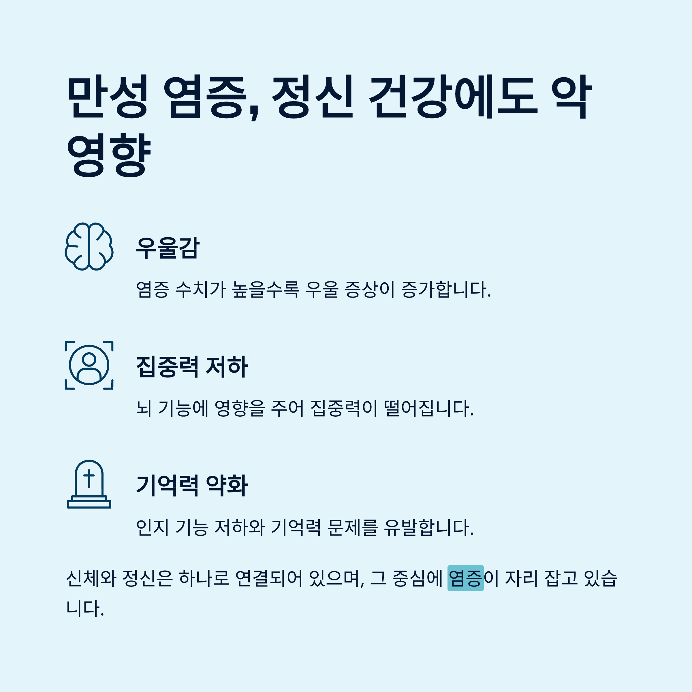 염증은 단순히 몸의 문제만이 아닙니다. 최근 연구에서는 염증 수치가 높을수록 우울감, 집중력 저하, 기억력 약화와 같은 정신적인 영향도 동반될 수 있다고 보고하고 있습니다. 신체와 정신은 하나로 연결되어 있으며, 그 중심에 염증이 자리 잡고 있습니다.