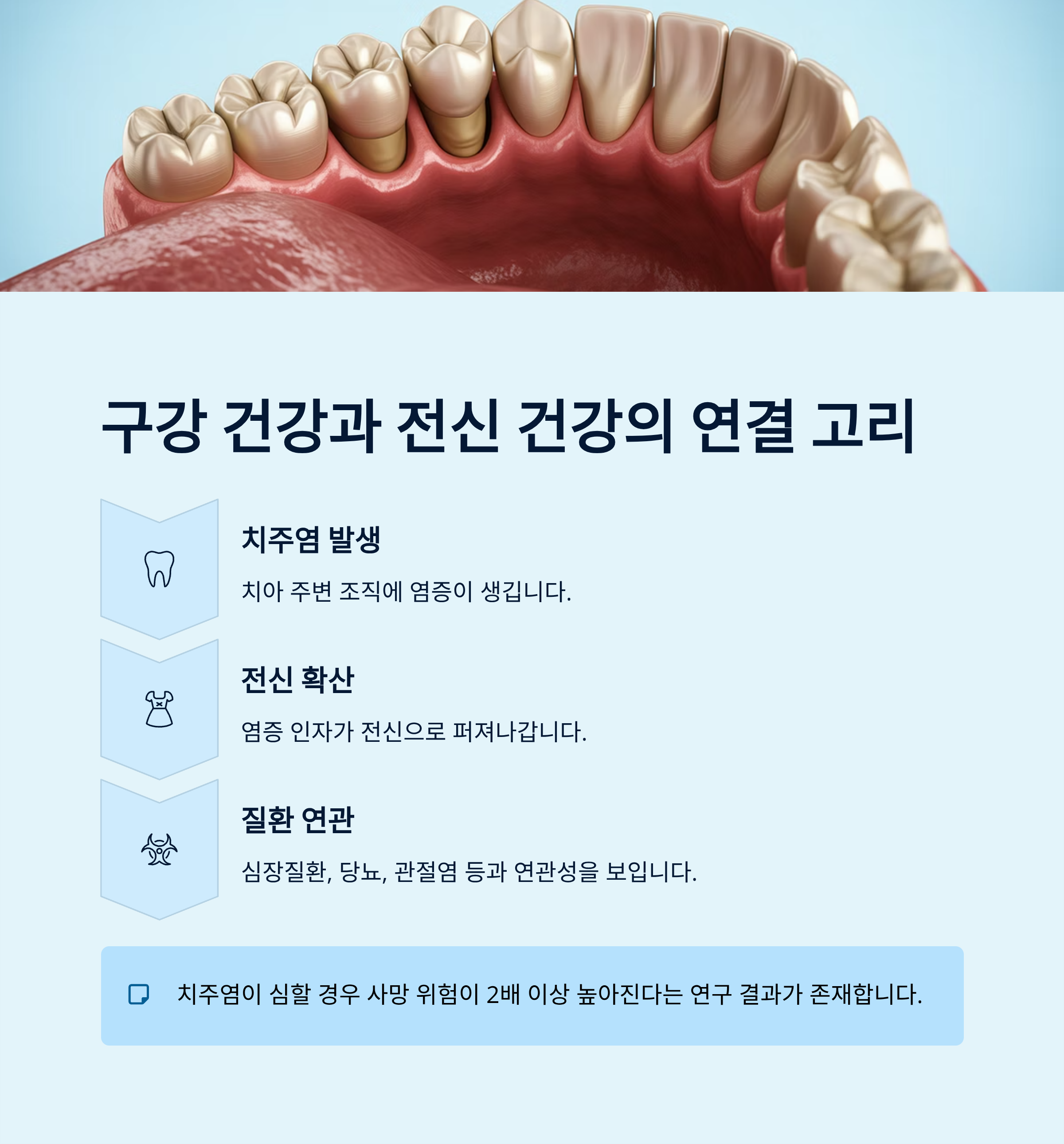 가장 흔하지만 간과하기 쉬운 만성 염증 중 하나가 바로 치주염입니다. 치아 주변 조직에 염증이 생기면, 그 염증 인자가 전신으로 퍼져 심장질환, 당뇨, 관절염 등과도 연관성을 보입니다. 특히, 치주염이 심할 경우 사망 위험이 2배 이상 높아진다는 연구 결과도 존재합니다.