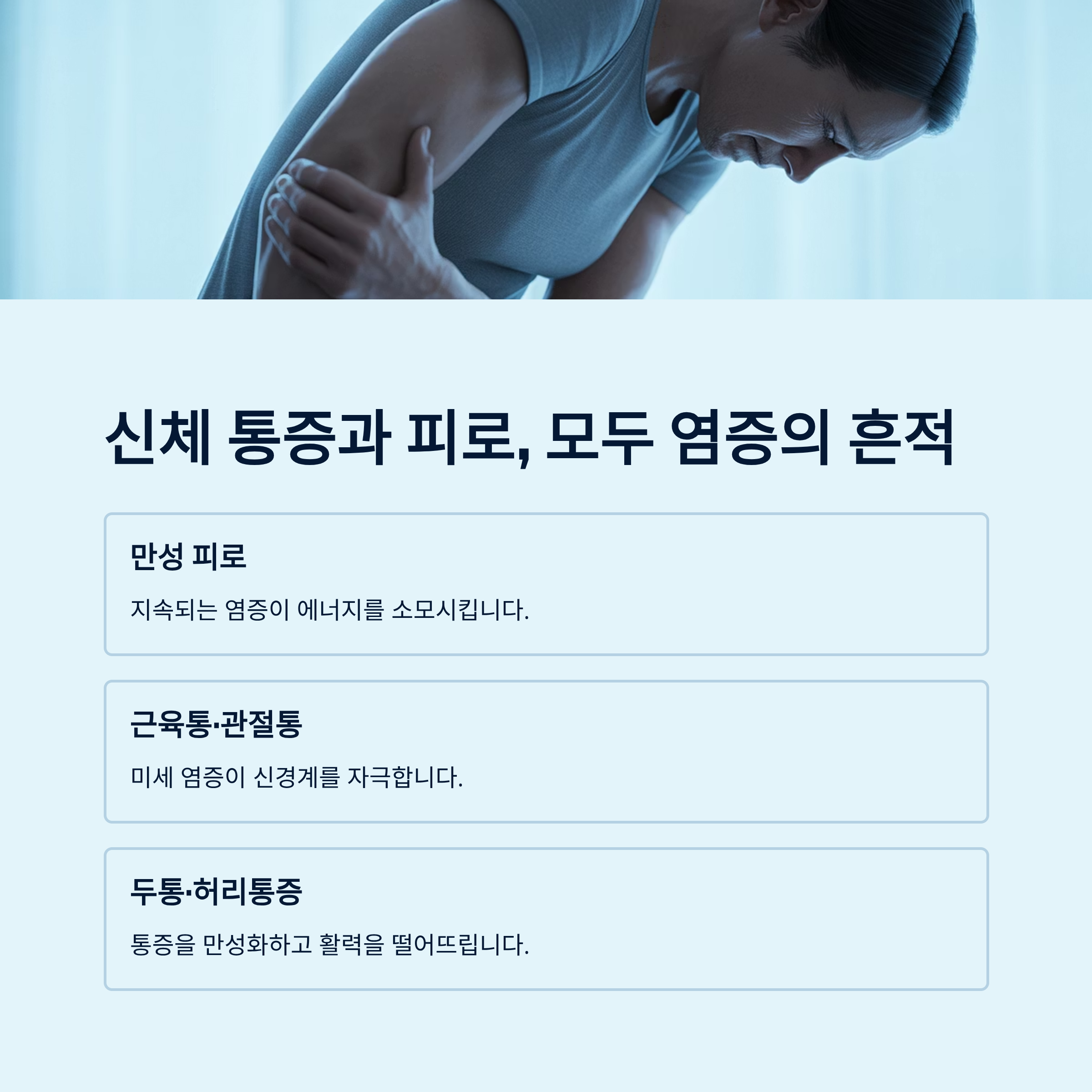 만성 피로, 근육통, 관절통, 허리통증, 두통 등 다양한 통증 증상들은 염증과 깊은 관련이 있습니다. 체내에 계속되는 미세 염증이 신경계를 자극해 통증을 만성화하고, 일상생활의 활력을 떨어뜨리는 결과를 낳습니다.