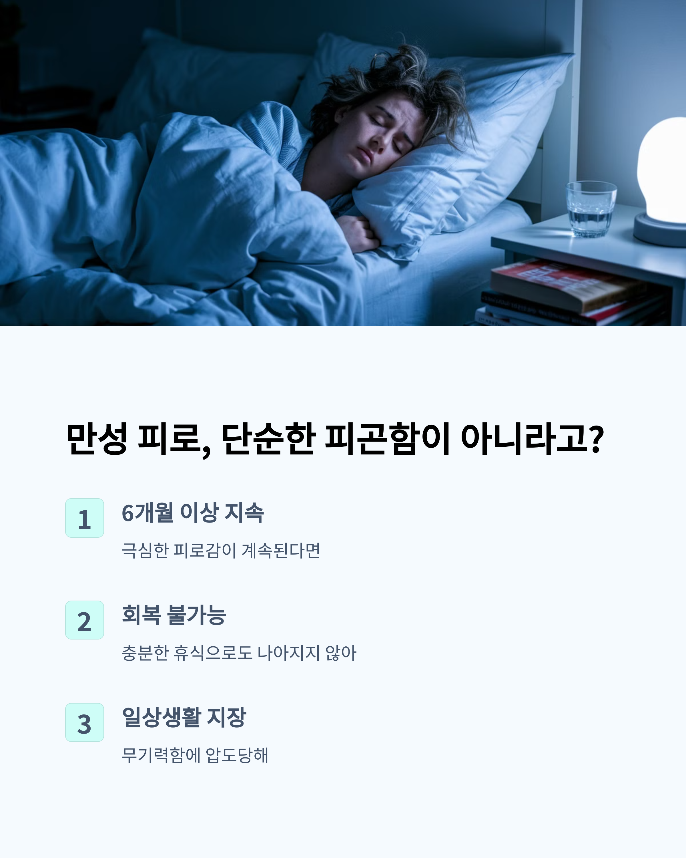 | 만성 피로란? | 단순한 피곤함이 아니라 몇 주 이상 지속되는 피로 상태를 의미합니다. |