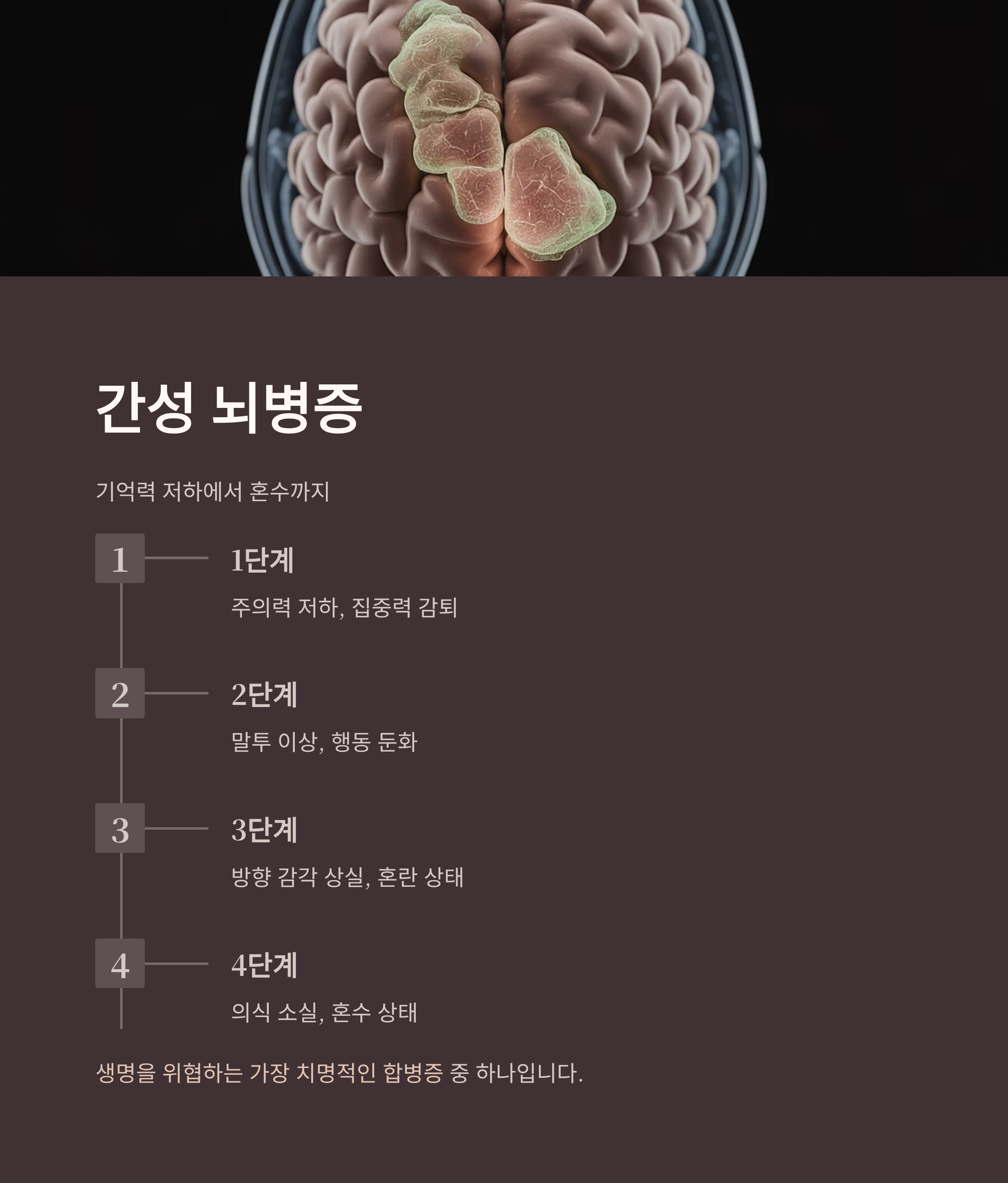 간 기능이 심각하게 저하되면 간성 뇌병증이 발생할 수 있습니다.