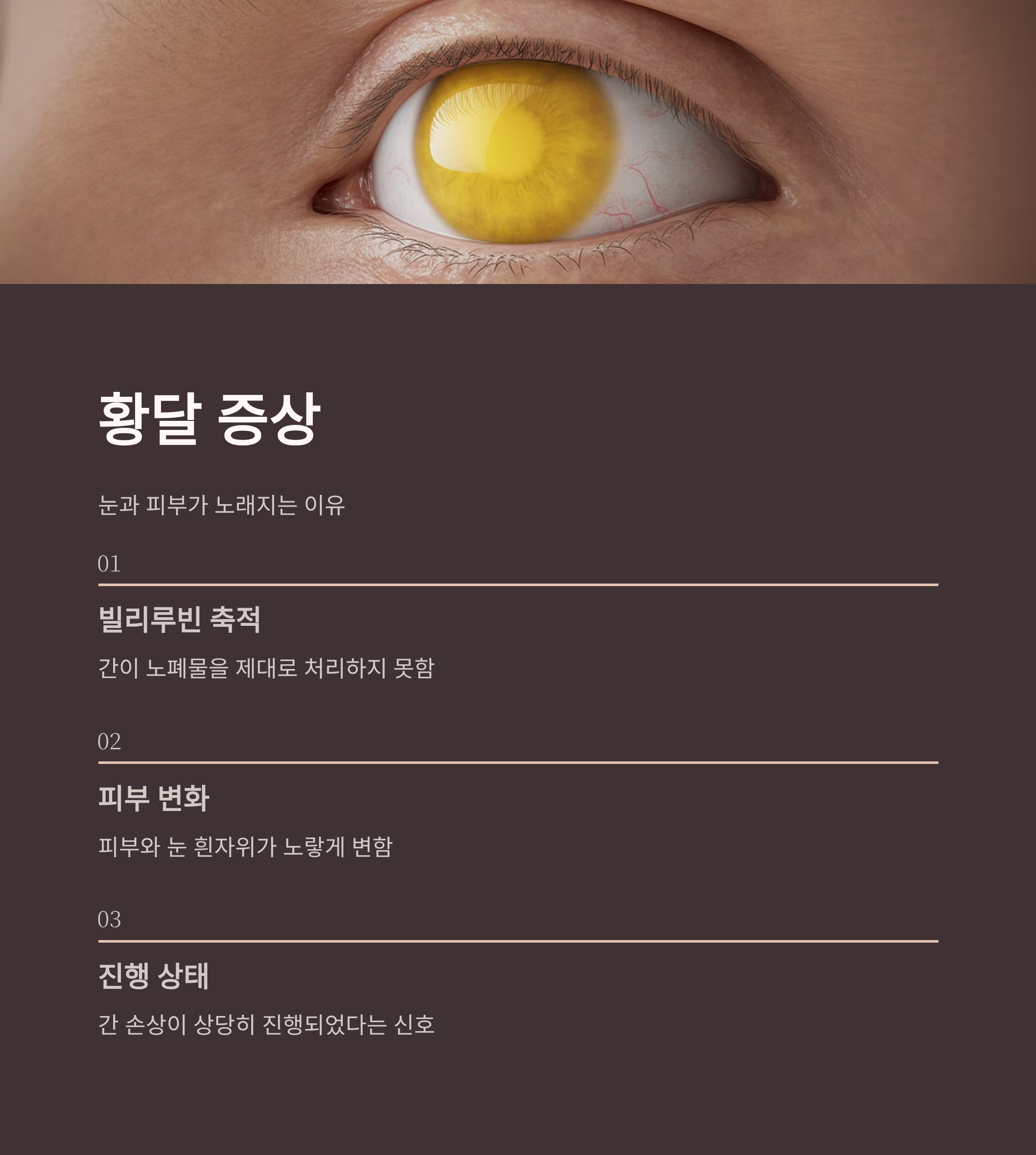 이로 인해 피부와 눈 흰자위가 노랗게 변하는 황달 증상이 나타나게 됩니다.
