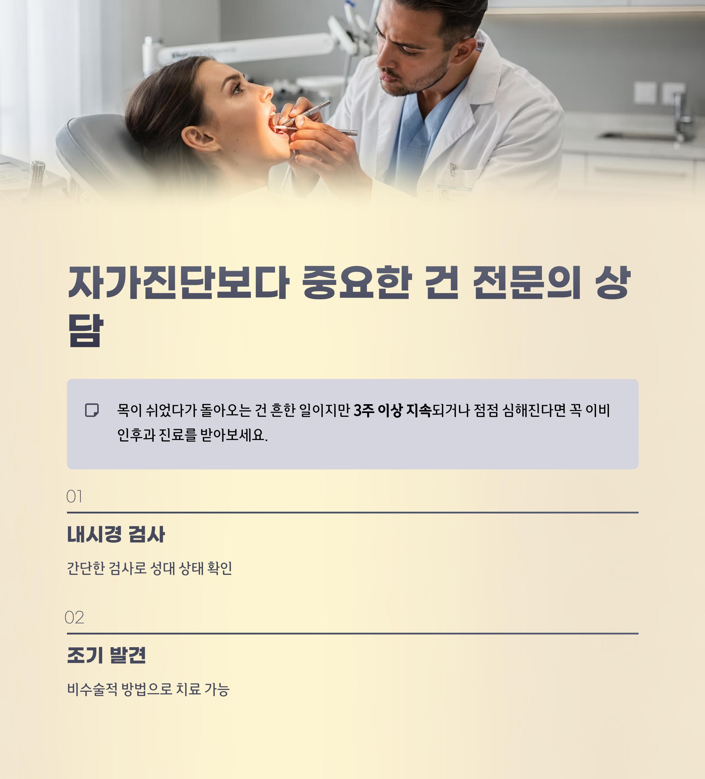3주 이상 지속되거나 점점 심해진다면 꼭 이비인후과 진료를 받아보세요.