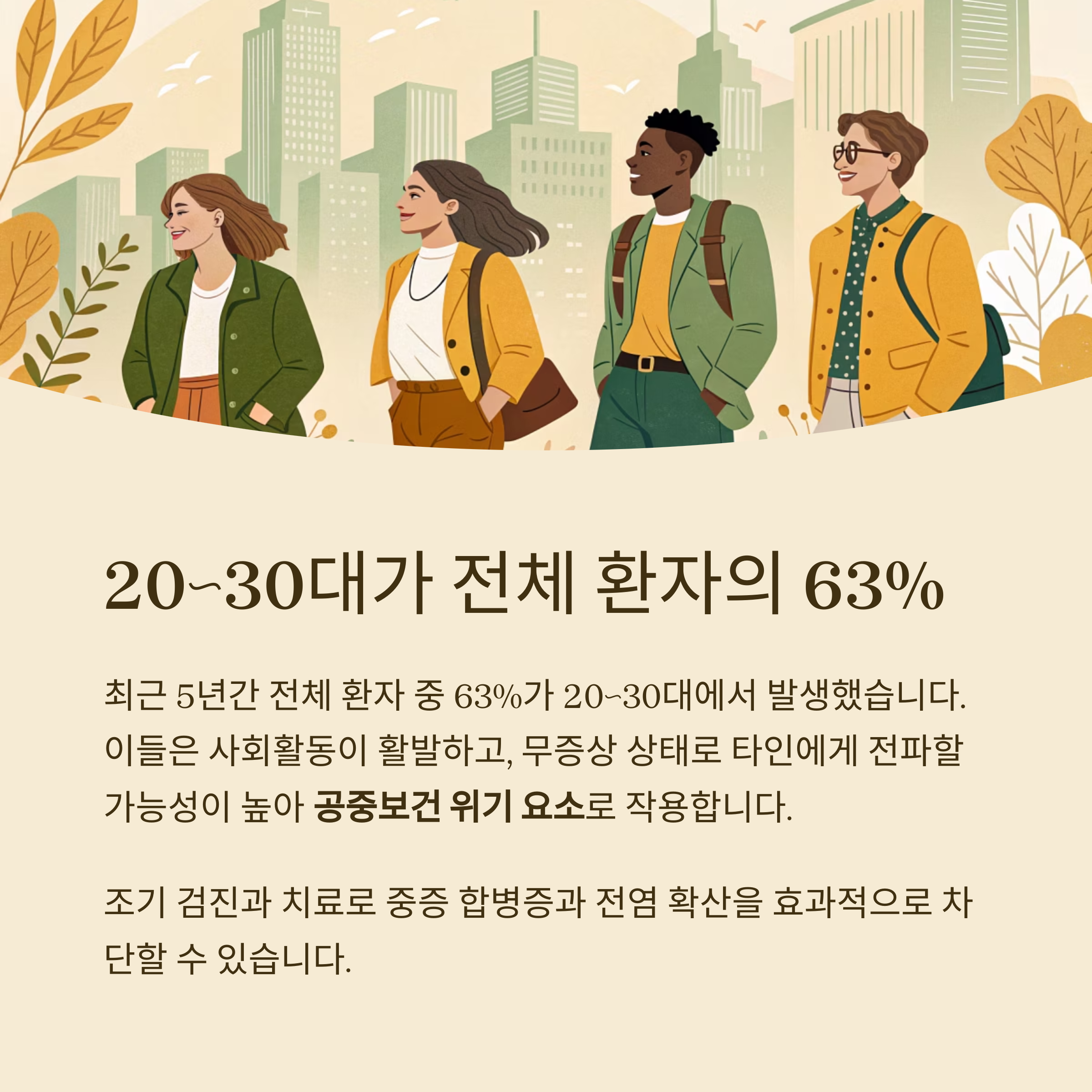 최근 5년간 전체 환자 중 63%가 20대 에서 30대 연령대에서 발생했습니다.