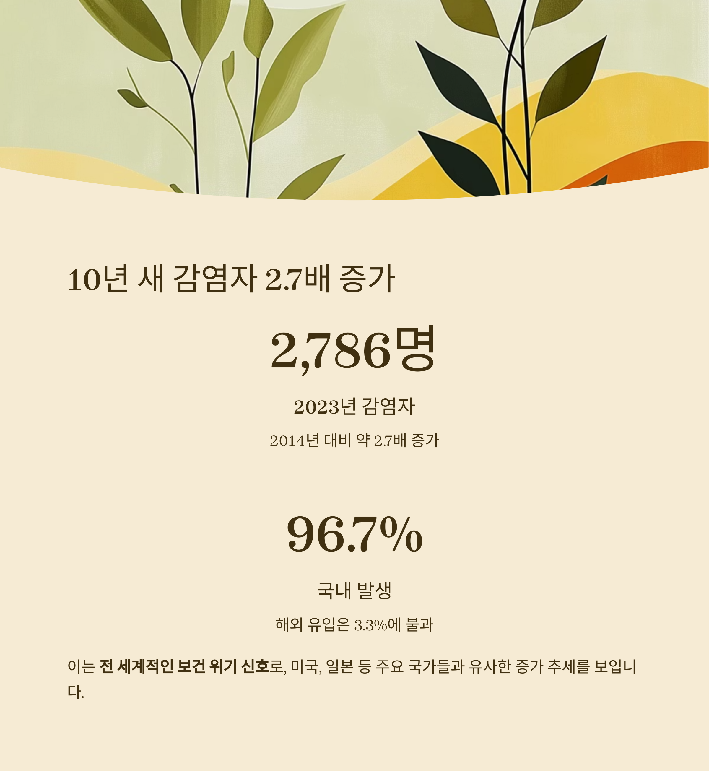 2023년 국내 매독 감염자는 총 2,786명으로 2014년 대비 약 2.7배 증가한 수치를 보였습니다.