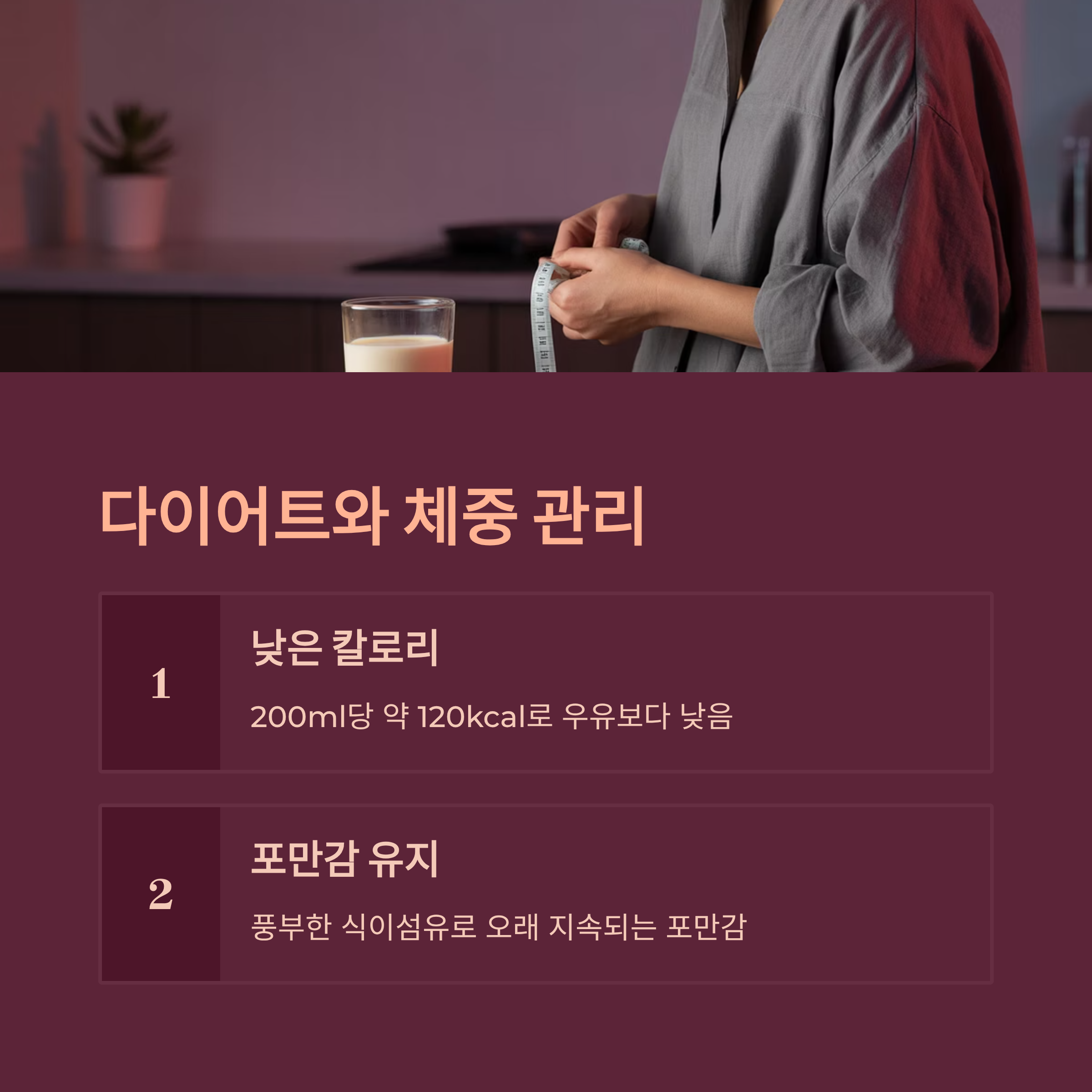 동물성 우유보다 칼로리는 낮고, 콜레스테롤이 없어 건강 관리에 유리하죠.