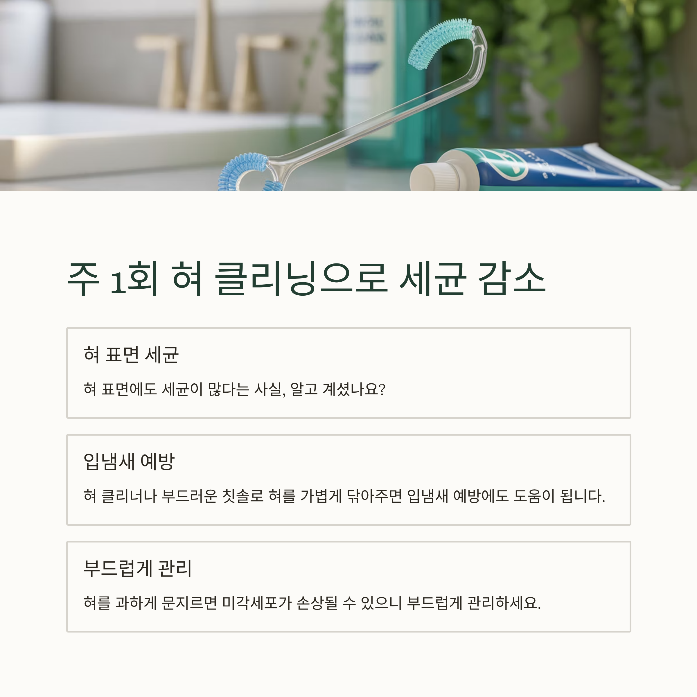 혀를 과하게 문지르면 미각세포가 손상될 수 있으니 부드럽게 관리하세요.