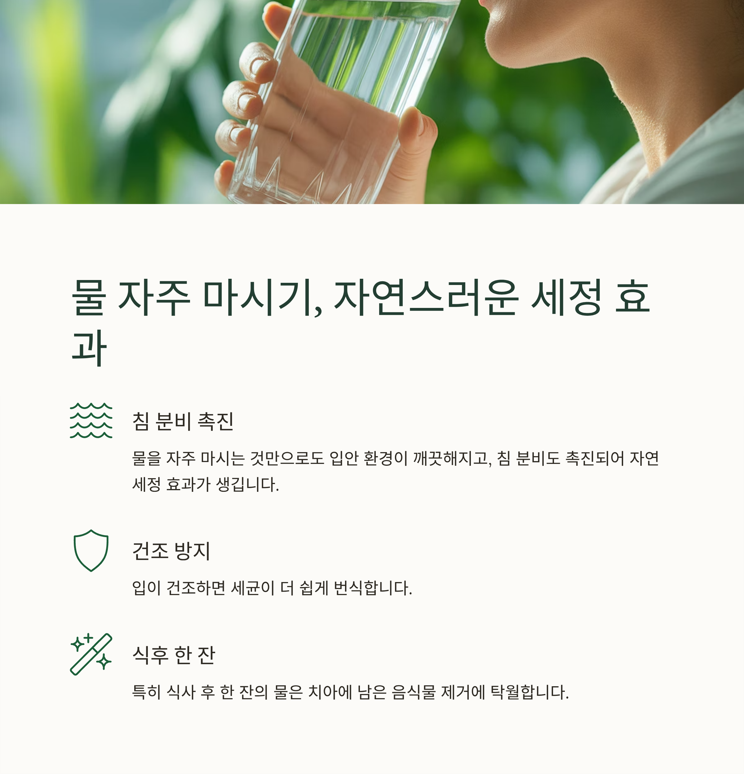 물을 자주 마시는 것만으로도 입안 환경이 깨끗해지고, 침 분비도 촉진되어 자연 세정 효과가 생깁니다.