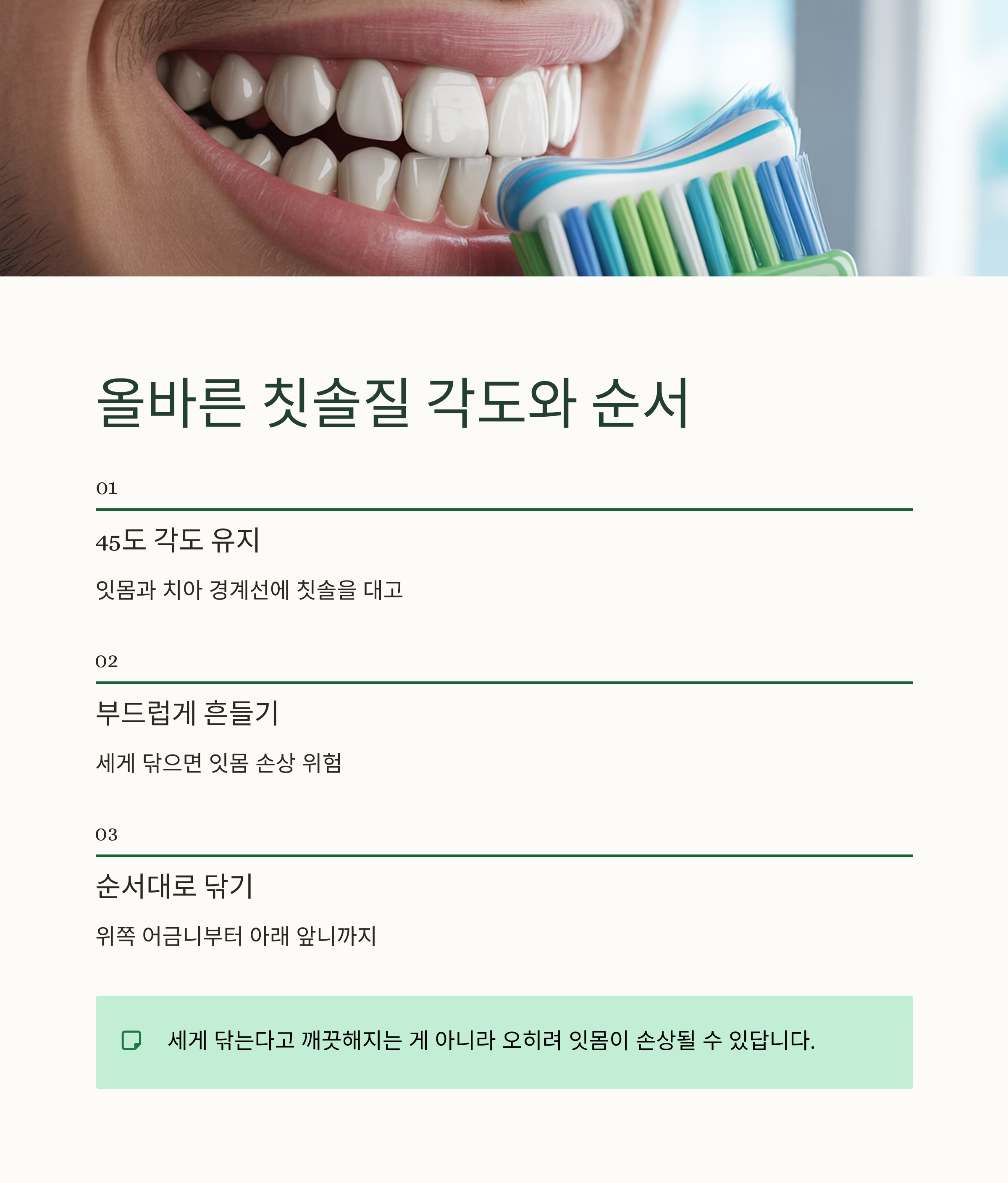 순서는 위쪽 어금니부터, 아래 앞니로 내려오면서 골고루 닦아주는 게 포인트예요.