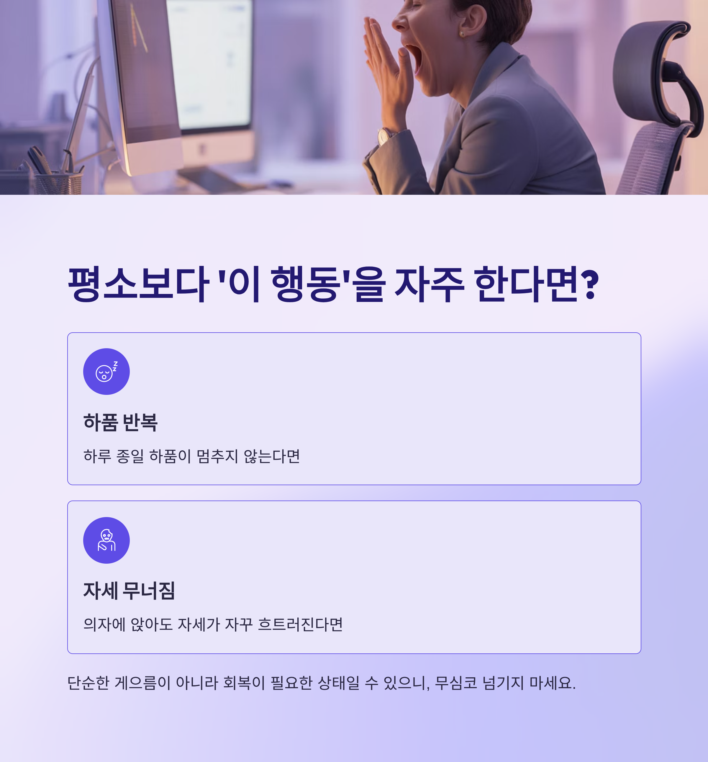하품을 자주 하고, 의자에 앉아도 자세가 자꾸 무너진다면 몸이 쉬고 싶다는 신호일 수 있어요.