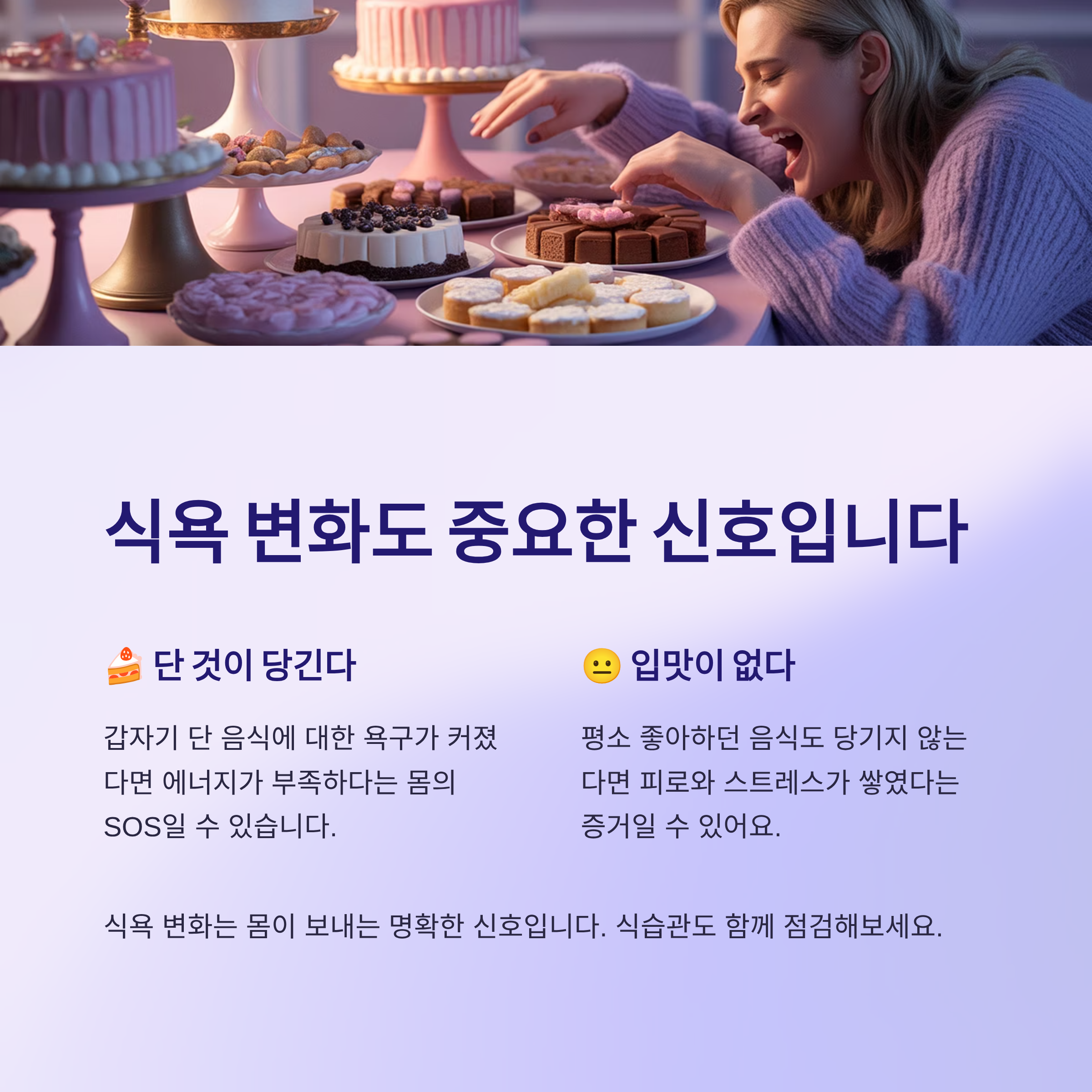 갑자기 단 것이 당기거나, 입맛이 없어진다면 피로와 스트레스가 쌓였다는 증거일 수 있어요.